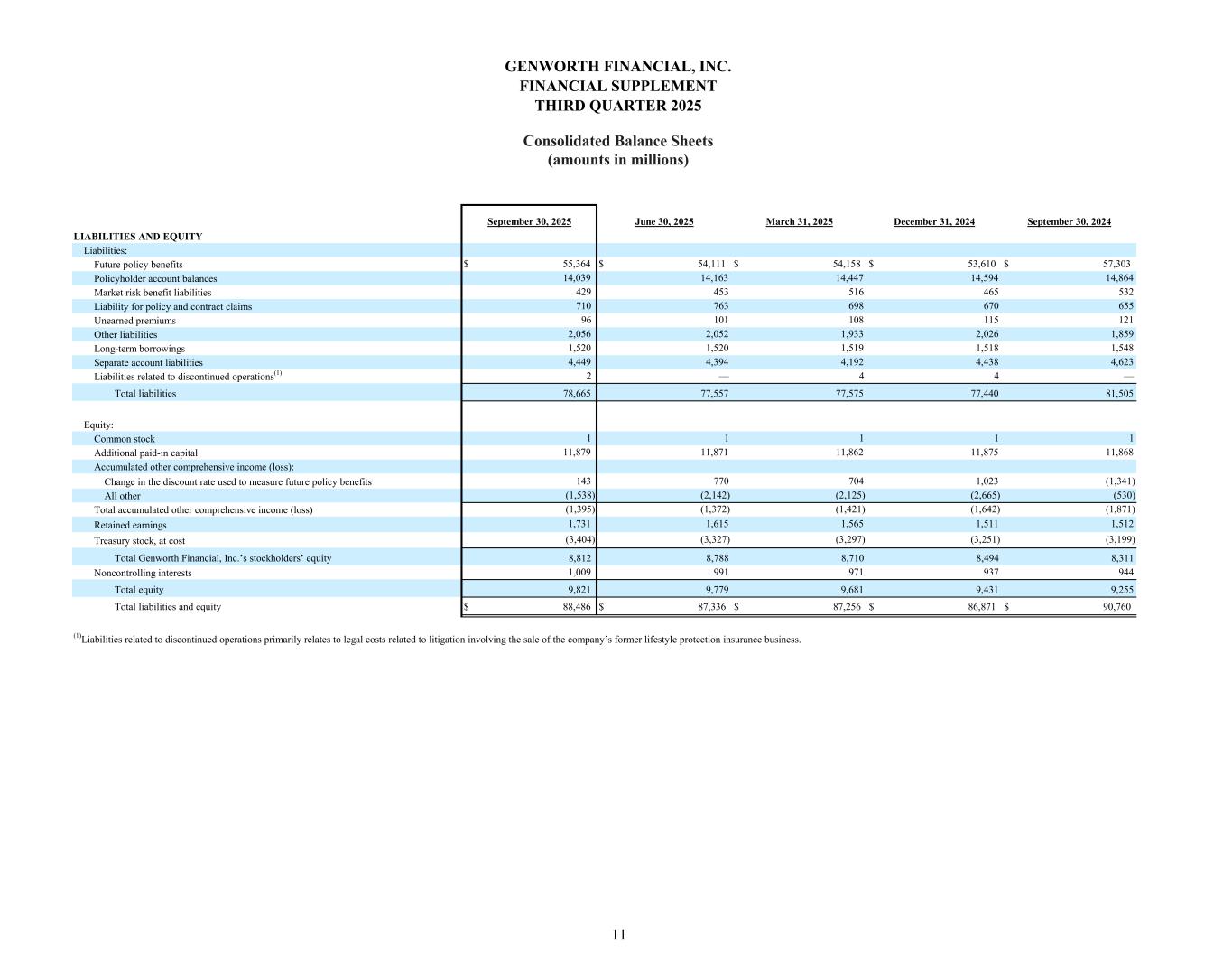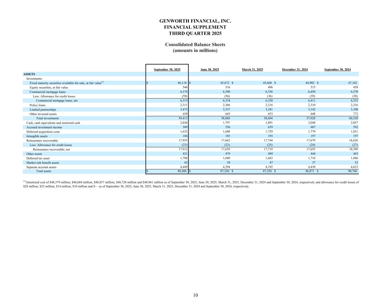 September 30, 2025 June 30, 2025 March 31, 2025 December 31, 2024 September 30, 2024 $ 46,110 $ 45,672 $ 45,668 $ 44,902 $ 47,342 546 516 496 515 458 6,374 6,390 6,356 6,450 6,570 (59) (56) (36) (39) (38) Commercial mortgage loans, net 6,315 6,334 6,320 6,411 6,532 2,311 2,366 2,316 2,310 2,316 3,473 3,337 3,241 3,142 3,100 658 643 653 648 772 Total investments 59,413 58,868 58,694 57,928 60,520 2,036 1,797 1,891 2,048 2,057 589 556 639 607 592 1,632 1,680 1,729 1,779 1,831 184 185 193 197 197 17,935 17,662 17,744 17,679 18,626 (23) (23) (25) (24) (27) 17,912 17,639 17,719 17,655 18,599 421 479 489 444 443 1,788 1,680 1,663 1,718 1,846 62 58 47 57 52 4,449 4,394 4,192 4,438 4,623 Total assets $ 88,486 $ 87,336 $ 87,256 $ 86,871 $ 90,760 Commercial mortgage loans Equity securities, at fair value Fixed maturity securities available-for-sale, at fair value(1) ASSETS Investments: Limited partnerships Policy loans Less: Allowance for credit losses Other invested assets Cash, cash equivalents and restricted cash Accrued investment income Reinsurance recoverable Less: Allowance for credit losses Intangible assets Deferred acquisition costs Market risk benefit assets Deferred tax asset Reinsurance recoverable, net Other assets Separate account assets GENWORTH FINANCIAL, INC. FINANCIAL SUPPLEMENT THIRD QUARTER 2025 Consolidated Balance Sheets (amounts in millions) 10 (1)Amortized cost of $48,379 million, $48,684 million, $48,837 million, $48,720 million and $48,961 million as of September 30, 2025, June 30, 2025, March 31, 2025, December 31, 2024 and September 30, 2024, respectively and allowance for credit losses of $28 million, $25 million, $14 million, $10 million and $— as of September 30, 2025, June 30, 2025, March 31, 2025, December 31, 2024 and September 30, 2024, respectively.