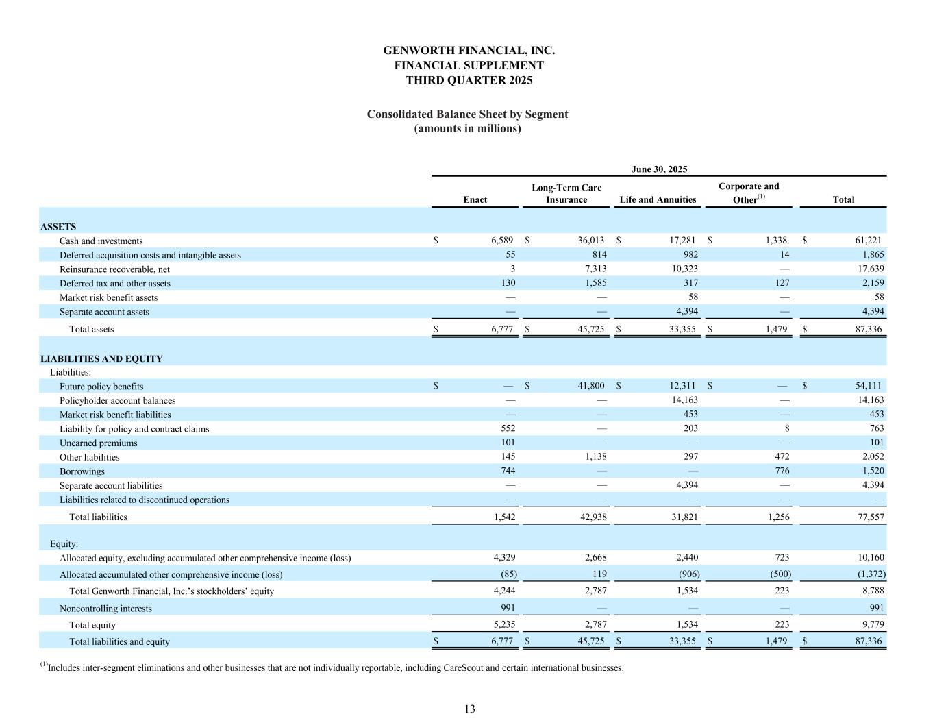 Enact Long-Term Care Insurance Life and Annuities Corporate and Other(1) Total $ 6,691 $ 36,635 $ 17,231 $ 1,481 $ 62,038 57 800 945 14 1,816 4 7,522 10,386 — 17,912 123 1,697 274 115 2,209 — — 62 — 62 — — 4,449 — 4,449 Total assets $ 6,875 $ 46,654 $ 33,347 $ 1,610 $ 88,486 $ — $ 43,017 $ 12,347 $ — $ 55,364 — — 14,039 — 14,039 — — 429 — 429 572 — 132 6 710 96 — — — 96 134 1,091 271 560 2,056 744 — — 776 1,520 — — 4,449 — 4,449 — — — 2 2 Total liabilities 1,546 44,108 31,667 1,344 78,665 4,354 2,730 2,447 676 10,207 (34) (184) (767) (410) (1,395) 4,320 2,546 1,680 266 8,812 1,009 — — — 1,009 5,329 2,546 1,680 266 9,821 $ 6,875 $ 46,654 $ 33,347 $ 1,610 $ 88,486 ASSETS Deferred acquisition costs and intangible assets Reinsurance recoverable, net Cash and investments September 30, 2025 Separate account assets Deferred tax and other assets Market risk benefit assets LIABILITIES AND EQUITY Liabilities: Future policy benefits Policyholder account balances Unearned premiums Other liabilities Liability for policy and contract claims Market risk benefit liabilities Liabilities associated with discontinued operations Borrowings Separate account liabilities Equity: Allocated equity, excluding accumulated other comprehensive income (loss) (1)Includes inter-segment eliminations and other businesses that are not individually reportable, including start-up businesses that offer fee-based services, advice, consulting and other aging care services, as well as long- term care insurance products, through the company’s CareScout business (“CareScout”), and certain international businesses. Allocated accumulated other comprehensive income (loss) Total Genworth Financial, Inc.’s stockholders’ equity Total liabilities and equity Total equity Noncontrolling interests GENWORTH FINANCIAL, INC. FINANCIAL SUPPLEMENT THIRD QUARTER 2025 Consolidated Balance Sheet by Segment (amounts in millions) 12