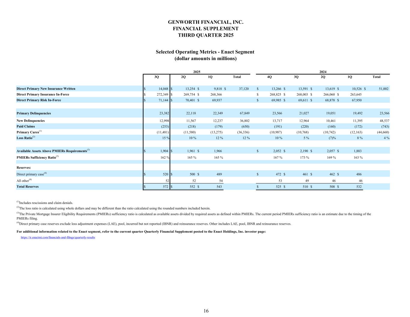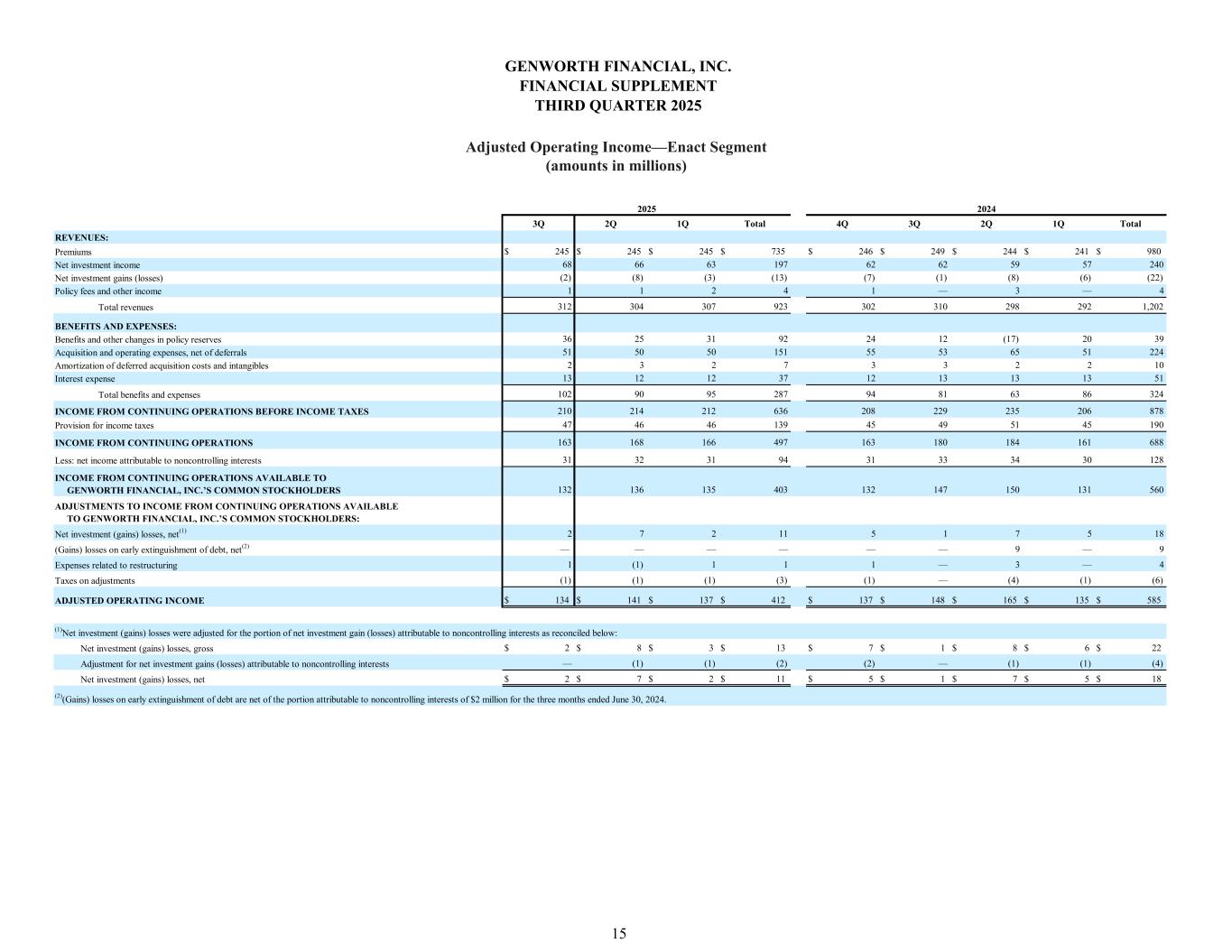 3Q 2Q 1Q Total 4Q 3Q 2Q 1Q Total $ 245 $ 245 $ 245 $ 735 $ 246 $ 249 $ 244 $ 241 $ 980 68 66 63 197 62 62 59 57 240 (2) (8) (3) (13) (7) (1) (8) (6) (22) 1 1 2 4 1 — 3 — 4 312 304 307 923 302 310 298 292 1,202 36 25 31 92 24 12 (17) 20 39 51 50 50 151 55 53 65 51 224 2 3 2 7 3 3 2 2 10 13 12 12 37 12 13 13 13 51 102 90 95 287 94 81 63 86 324 210 214 212 636 208 229 235 206 878 47 46 46 139 45 49 51 45 190 163 168 166 497 163 180 184 161 688 31 32 31 94 31 33 34 30 128 132 136 135 403 132 147 150 131 560 2 7 2 11 5 1 7 5 18 — — — — — — 9 — 9 1 (1) 1 1 1 — 3 — 4 (1) (1) (1) (3) (1) — (4) (1) (6) $ 134 $ 141 $ 137 $ 412 $ 137 $ 148 $ 165 $ 135 $ 585 $ 2 $ 8 $ 3 $ 13 $ 7 $ 1 $ 8 $ 6 $ 22 — (1) (1) (2) (2) — (1) (1) (4) $ 2 $ 7 $ 2 $ 11 $ 5 $ 1 $ 7 $ 5 $ 18 ADJUSTED OPERATING INCOME Net investment (gains) losses, gross (1)Net investment (gains) losses were adjusted for the portion of net investment gain (losses) attributable to noncontrolling interests as reconciled below: (2)(Gains) losses on early extinguishment of debt are net of the portion attributable to noncontrolling interests of $2 million for the three months ended June 30, 2024. Net investment (gains) losses, net Adjustment for net investment gains (losses) attributable to noncontrolling interests ADJUSTMENTS TO INCOME FROM CONTINUING OPERATIONS AVAILABLE TO GENWORTH FINANCIAL, INC.’S COMMON STOCKHOLDERS: (Gains) losses on early extinguishment of debt, net(2) Net investment (gains) losses, net(1) Taxes on adjustments Expenses related to restructuring INCOME FROM CONTINUING OPERATIONS BEFORE INCOME TAXES Provision for income taxes Less: net income attributable to noncontrolling interests INCOME FROM CONTINUING OPERATIONS GENWORTH FINANCIAL, INC.’S COMMON STOCKHOLDERS INCOME FROM CONTINUING OPERATIONS AVAILABLE TO BENEFITS AND EXPENSES: Benefits and other changes in policy reserves Amortization of deferred acquisition costs and intangibles Acquisition and operating expenses, net of deferrals Total benefits and expenses Interest expense 2025 2024 Total revenues Policy fees and other income REVENUES: Premiums Net investment gains (losses) Net investment income GENWORTH FINANCIAL, INC. FINANCIAL SUPPLEMENT THIRD QUARTER 2025 15 Adjusted Operating Income—Enact Segment (amounts in millions)