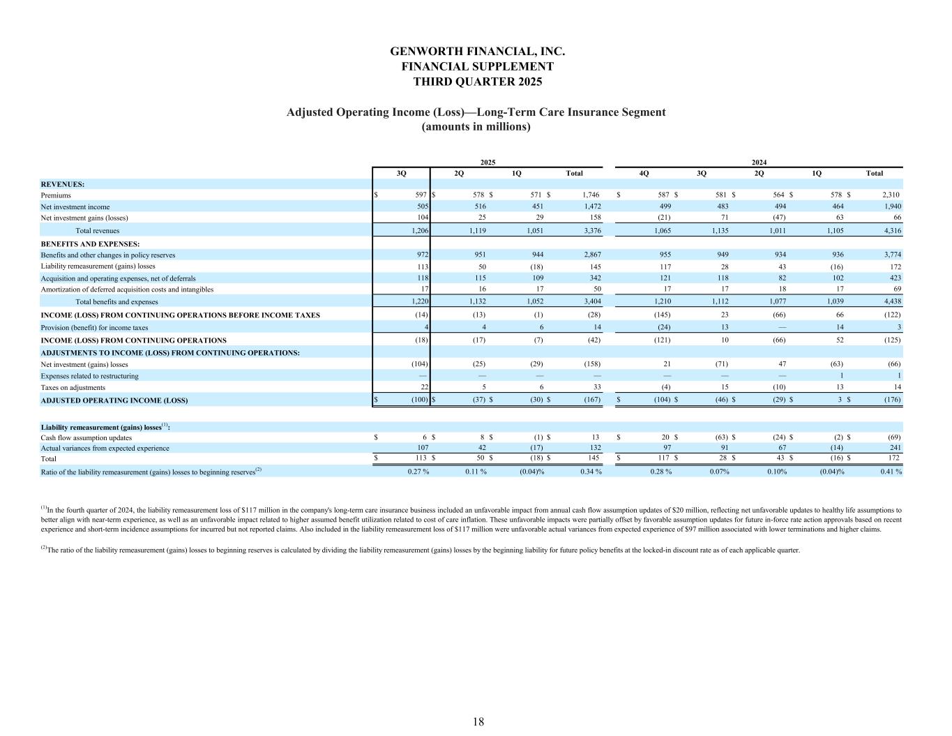3Q 2Q 1Q Total 4Q 3Q 2Q 1Q Total $ 597 $ 578 $ 571 $ 1,746 $ 587 $ 581 $ 564 $ 578 $ 2,310 505 516 451 1,472 499 483 494 464 1,940 104 25 29 158 (21) 71 (47) 63 66 Total revenues 1,206 1,119 1,051 3,376 1,065 1,135 1,011 1,105 4,316 972 951 944 2,867 955 949 934 936 3,774 113 50 (18) 145 117 28 43 (16) 172 118 115 109 342 121 118 82 102 423 17 16 17 50 17 17 18 17 69 1,220 1,132 1,052 3,404 1,210 1,112 1,077 1,039 4,438 (14) (13) (1) (28) (145) 23 (66) 66 (122) 4 4 6 14 (24) 13 — 14 3 (18) (17) (7) (42) (121) 10 (66) 52 (125) (104) (25) (29) (158) 21 (71) 47 (63) (66) — — — — — — — 1 1 22 5 6 33 (4) 15 (10) 13 14 $ (100) $ (37) $ (30) $ (167) $ (104) $ (46) $ (29) $ 3 $ (176) $ 6 $ 8 $ (1) $ 13 $ 20 $ (63) $ (24) $ (2) $ (69) 107 42 (17) 132 97 91 67 (14) 241 $ 113 $ 50 $ (18) $ 145 $ 117 $ 28 $ 43 $ (16) $ 172 0.27 % 0.11 % (0.04)% 0.34 % 0.28 % 0.07% 0.10% (0.04)% 0.41 % 2024 BENEFITS AND EXPENSES: Benefits and other changes in policy reserves REVENUES: Premiums Net investment gains (losses) Net investment income 2025 Liability remeasurement (gains) losses Amortization of deferred acquisition costs and intangibles Acquisition and operating expenses, net of deferrals Total benefits and expenses INCOME (LOSS) FROM CONTINUING OPERATIONS BEFORE INCOME TAXES Provision (benefit) for income taxes INCOME (LOSS) FROM CONTINUING OPERATIONS Net investment (gains) losses ADJUSTMENTS TO INCOME (LOSS) FROM CONTINUING OPERATIONS: Taxes on adjustments Expenses related to restructuring Ratio of the liability remeasurement (gains) losses to beginning reserves(2) (1)In the fourth quarter of 2024, the liability remeasurement loss of $117 million in the company's long-term care insurance business included an unfavorable impact from annual cash flow assumption updates of $20 million, reflecting net unfavorable updates to healthy life assumptions to better align with near-term experience, as well as an unfavorable impact related to higher assumed benefit utilization related to cost of care inflation. These unfavorable impacts were partially offset by favorable assumption updates for future in-force rate action approvals based on recent experience and short-term incidence assumptions for incurred but not reported claims. Also included in the liability remeasurement loss of $117 million were unfavorable actual variances from expected experience of $97 million associated with lower terminations and higher claims. (2)The ratio of the liability remeasurement (gains) losses to beginning reserves is calculated by dividing the liability remeasurement (gains) losses by the beginning liability for future policy benefits at the locked-in discount rate as of each applicable quarter. ADJUSTED OPERATING INCOME (LOSS) Cash flow assumption updates Liability remeasurement (gains) losses(1): Total Actual variances from expected experience GENWORTH FINANCIAL, INC. FINANCIAL SUPPLEMENT THIRD QUARTER 2025 Adjusted Operating Income (Loss)—Long-Term Care Insurance Segment (amounts in millions) 18