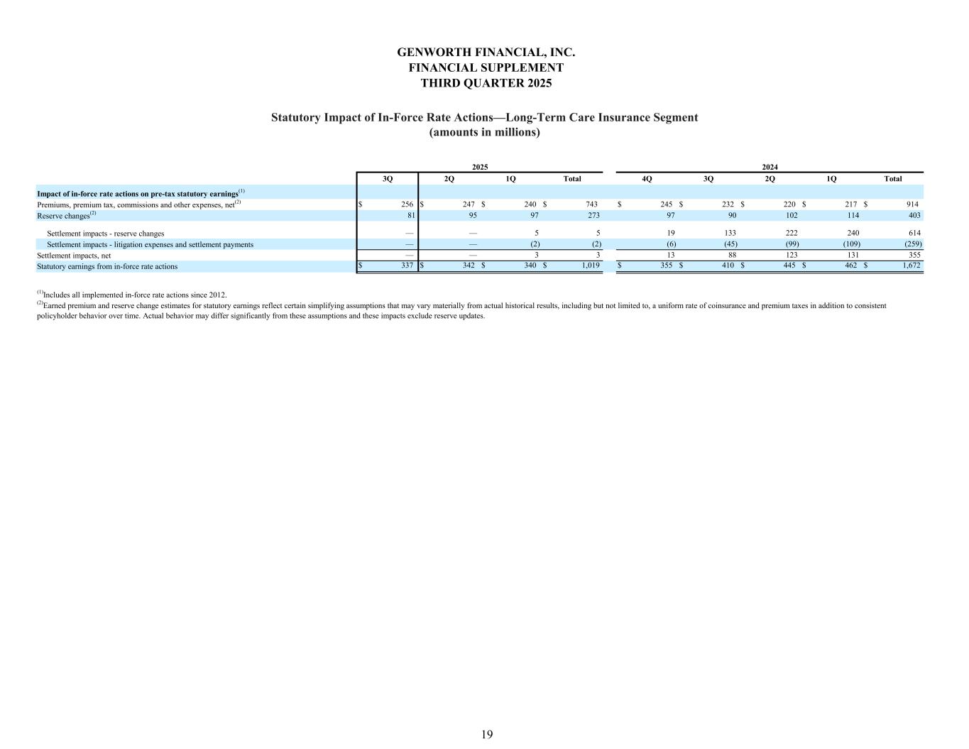 3Q 2Q 1Q Total 4Q 3Q 2Q 1Q Total $ 256 $ 247 $ 240 $ 743 $ 245 $ 232 $ 220 $ 217 $ 914 81 95 97 273 97 90 102 114 403 — — 5 5 19 133 222 240 614 — — (2) (2) (6) (45) (99) (109) (259) — — 3 3 13 88 123 131 355 $ 337 $ 342 $ 340 $ 1,019 $ 355 $ 410 $ 445 $ 462 $ 1,672 2024 (1)Includes all implemented in-force rate actions since 2012. (2)Earned premium and reserve change estimates for statutory earnings reflect certain simplifying assumptions that may vary materially from actual historical results, including but not limited to, a uniform rate of coinsurance and premium taxes in addition to consistent policyholder behavior over time. Actual behavior may differ significantly from these assumptions and these impacts exclude reserve updates. Settlement impacts, net Settlement impacts - litigation expenses and settlement payments Statutory earnings from in-force rate actions Impact of in-force rate actions on pre-tax statutory earnings(1) Premiums, premium tax, commissions and other expenses, net(2) Settlement impacts - reserve changes Reserve changes(2) 2025 GENWORTH FINANCIAL, INC. FINANCIAL SUPPLEMENT THIRD QUARTER 2025 Statutory Impact of In-Force Rate Actions—Long-Term Care Insurance Segment (amounts in millions) 19