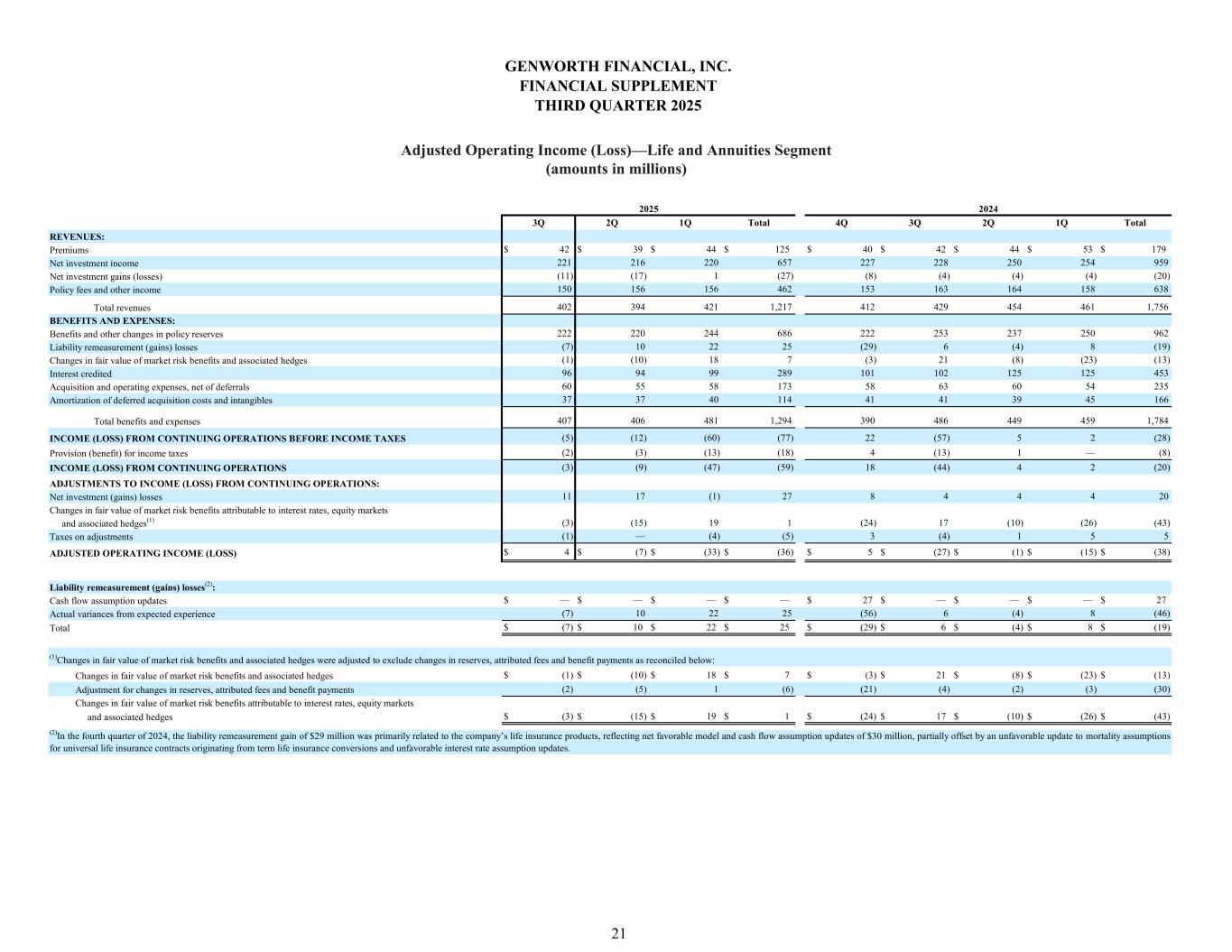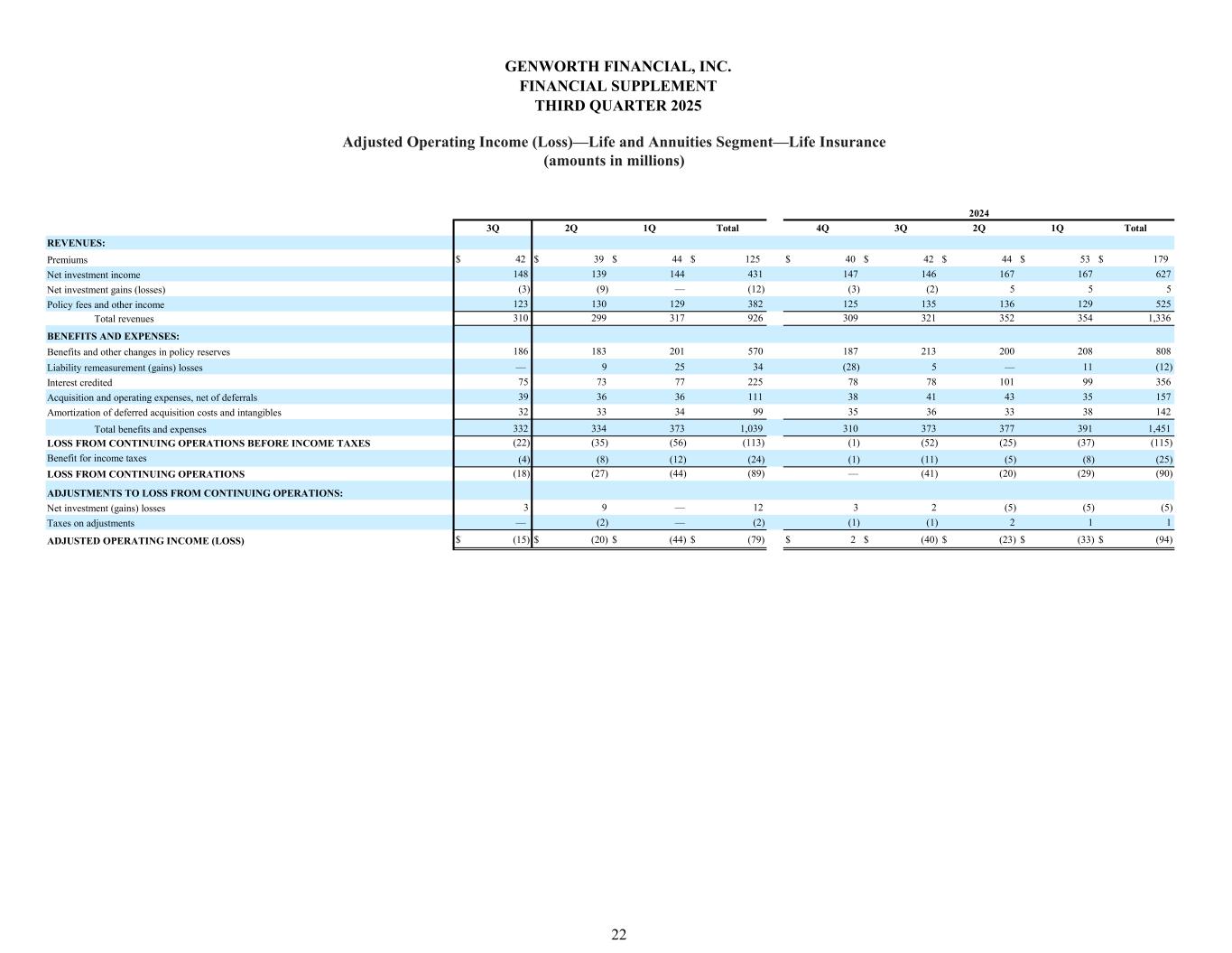 3Q 2Q 1Q Total 4Q 3Q 2Q 1Q Total $ 42 $ 39 $ 44 $ 125 $ 40 $ 42 $ 44 $ 53 $ 179 148 139 144 431 147 146 167 167 627 (3) (9) — (12) (3) (2) 5 5 5 123 130 129 382 125 135 136 129 525 310 299 317 926 309 321 352 354 1,336 186 183 201 570 187 213 200 208 808 — 9 25 34 (28) 5 — 11 (12) 75 73 77 225 78 78 101 99 356 39 36 36 111 38 41 43 35 157 32 33 34 99 35 36 33 38 142 332 334 373 1,039 310 373 377 391 1,451 (22) (35) (56) (113) (1) (52) (25) (37) (115) (4) (8) (12) (24) (1) (11) (5) (8) (25) (18) (27) (44) (89) — (41) (20) (29) (90) 3 9 — 12 3 2 (5) (5) (5) — (2) — (2) (1) (1) 2 1 1 $ (15) $ (20) $ (44) $ (79) $ 2 $ (40) $ (23) $ (33) $ (94) 2024 Total revenues Policy fees and other income REVENUES: Premiums Net investment gains (losses) Net investment income BENEFITS AND EXPENSES: Benefits and other changes in policy reserves Interest credited Liability remeasurement (gains) losses Amortization of deferred acquisition costs and intangibles Acquisition and operating expenses, net of deferrals Taxes on adjustments ADJUSTED OPERATING INCOME (LOSS) Total benefits and expenses LOSS FROM CONTINUING OPERATIONS BEFORE INCOME TAXES LOSS FROM CONTINUING OPERATIONS Benefit for income taxes Net investment (gains) losses ADJUSTMENTS TO LOSS FROM CONTINUING OPERATIONS: GENWORTH FINANCIAL, INC. FINANCIAL SUPPLEMENT THIRD QUARTER 2025 Adjusted Operating Income (Loss)—Life and Annuities Segment—Life Insurance (amounts in millions) 22