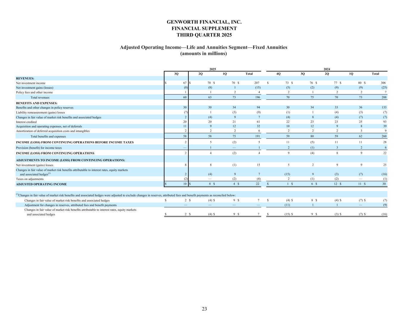 3Q 2Q 1Q Total 4Q 3Q 2Q 1Q Total $ 67 $ 70 $ 70 $ 207 $ 73 $ 76 $ 77 $ 80 $ 306 (8) (8) 1 (15) (5) (2) (9) (9) (25) 1 1 2 4 2 1 2 2 7 60 63 73 196 70 75 70 73 288 30 30 34 94 30 34 33 36 133 (7) 1 (3) (9) (1) 1 (4) (3) (7) 2 (4) 9 7 (4) 8 (4) (7) (7) 20 20 21 61 22 23 23 25 93 11 9 12 32 10 12 9 8 39 2 2 2 6 2 2 2 3 9 58 58 75 191 59 80 59 62 260 2 5 (2) 5 11 (5) 11 11 28 — 1 — 1 2 (1) 3 2 6 2 4 (2) 4 9 (4) 8 9 22 8 8 (1) 15 5 2 9 9 25 2 (4) 9 7 (15) 9 (3) (7) (16) (2) — (2) (4) 2 (1) (2) — (1) $ 10 $ 8 $ 4 $ 22 $ 1 $ 6 $ 12 $ 11 $ 30 $ 2 $ (4) $ 9 $ 7 $ (4) $ 8 $ (4) $ (7) $ (7) — — — — (11) 1 1 — (9) $ 2 $ (4) $ 9 $ 7 $ (15) $ 9 $ (3) $ (7) $ (16) 2025 2024 Total revenues BENEFITS AND EXPENSES: REVENUES: Net investment income Policy fees and other income Net investment gains (losses) Benefits and other changes in policy reserves Liability remeasurement (gains) losses Interest credited Changes in fair value of market risk benefits and associated hedges Amortization of deferred acquisition costs and intangibles Acquisition and operating expenses, net of deferrals INCOME (LOSS) FROM CONTINUING OPERATIONS BEFORE INCOME TAXES INCOME (LOSS) FROM CONTINUING OPERATIONS Provision (benefit) for income taxes Total benefits and expenses Net investment (gains) losses ADJUSTMENTS TO INCOME (LOSS) FROM CONTINUING OPERATIONS: Adjustment for changes in reserves, attributed fees and benefit payments and associated hedges Changes in fair value of market risk benefits attributable to interest rates, equity markets (1)Changes in fair value of market risk benefits and associated hedges were adjusted to exclude changes in reserves, attributed fees and benefit payments as reconciled below: Changes in fair value of market risk benefits attributable to interest rates, equity markets and associated hedges(1) ADJUSTED OPERATING INCOME Taxes on adjustments Changes in fair value of market risk benefits and associated hedges GENWORTH FINANCIAL, INC. FINANCIAL SUPPLEMENT THIRD QUARTER 2025 Adjusted Operating Income—Life and Annuities Segment—Fixed Annuities (amounts in millions) 23