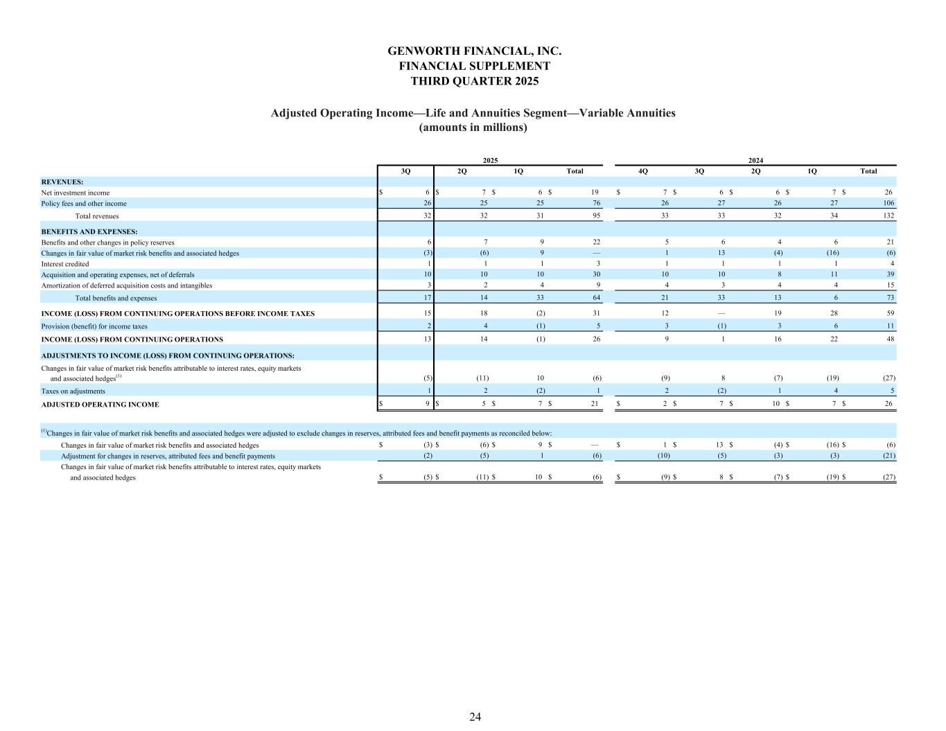 3Q 2Q 1Q Total 4Q 3Q 2Q 1Q Total $ 6 $ 7 $ 6 $ 19 $ 7 $ 6 $ 6 $ 7 $ 26 26 25 25 76 26 27 26 27 106 32 32 31 95 33 33 32 34 132 6 7 9 22 5 6 4 6 21 (3) (6) 9 — 1 13 (4) (16) (6) 1 1 1 3 1 1 1 1 4 10 10 10 30 10 10 8 11 39 3 2 4 9 4 3 4 4 15 17 14 33 64 21 33 13 6 73 15 18 (2) 31 12 — 19 28 59 2 4 (1) 5 3 (1) 3 6 11 13 14 (1) 26 9 1 16 22 48 (5) (11) 10 (6) (9) 8 (7) (19) (27) 1 2 (2) 1 2 (2) 1 4 5 $ 9 $ 5 $ 7 $ 21 $ 2 $ 7 $ 10 $ 7 $ 26 $ (3) $ (6) $ 9 $ — $ 1 $ 13 $ (4) $ (16) $ (6) (2) (5) 1 (6) (10) (5) (3) (3) (21) $ (5) $ (11) $ 10 $ (6) $ (9) $ 8 $ (7) $ (19) $ (27) 2025 2024 Benefits and other changes in policy reserves BENEFITS AND EXPENSES: REVENUES: Net investment income Policy fees and other income Total revenues Changes in fair value of market risk benefits and associated hedges Interest credited Amortization of deferred acquisition costs and intangibles Acquisition and operating expenses, net of deferrals Total benefits and expenses INCOME (LOSS) FROM CONTINUING OPERATIONS BEFORE INCOME TAXES Provision (benefit) for income taxes INCOME (LOSS) FROM CONTINUING OPERATIONS Changes in fair value of market risk benefits attributable to interest rates, equity markets ADJUSTMENTS TO INCOME (LOSS) FROM CONTINUING OPERATIONS: and associated hedges (1)Changes in fair value of market risk benefits and associated hedges were adjusted to exclude changes in reserves, attributed fees and benefit payments as reconciled below: Taxes on adjustments and associated hedges(1) ADJUSTED OPERATING INCOME Changes in fair value of market risk benefits and associated hedges Changes in fair value of market risk benefits attributable to interest rates, equity markets Adjustment for changes in reserves, attributed fees and benefit payments GENWORTH FINANCIAL, INC. FINANCIAL SUPPLEMENT THIRD QUARTER 2025 Adjusted Operating Income—Life and Annuities Segment—Variable Annuities (amounts in millions) 24