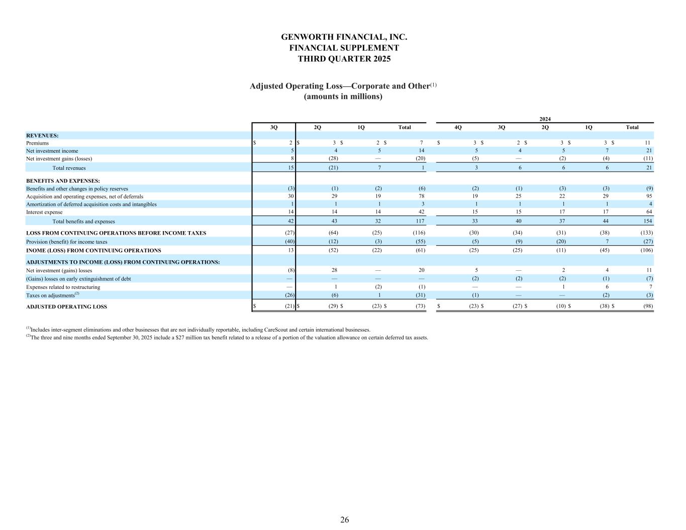 3Q 2Q 1Q Total 4Q 3Q 2Q 1Q Total $ 2 $ 3 $ 2 $ 7 $ 3 $ 2 $ 3 $ 3 $ 11 5 4 5 14 5 4 5 7 21 8 (28) — (20) (5) — (2) (4) (11) 15 (21) 7 1 3 6 6 6 21 (3) (1) (2) (6) (2) (1) (3) (3) (9) 30 29 19 78 19 25 22 29 95 1 1 1 3 1 1 1 1 4 14 14 14 42 15 15 17 17 64 42 43 32 117 33 40 37 44 154 (27) (64) (25) (116) (30) (34) (31) (38) (133) (40) (12) (3) (55) (5) (9) (20) 7 (27) 13 (52) (22) (61) (25) (25) (11) (45) (106) (8) 28 — 20 5 — 2 4 11 — — — — (2) (2) (2) (1) (7) — 1 (2) (1) — — 1 6 7 (26) (6) 1 (31) (1) — — (2) (3) $ (21) $ (29) $ (23) $ (73) $ (23) $ (27) $ (10) $ (38) $ (98) Total benefits and expenses Taxes on adjustments(2) ADJUSTED OPERATING LOSS (1) Provision (benefit) for income taxes INOME (LOSS) FROM CONTINUING OPERATIONS Net investment (gains) losses ADJUSTMENTS TO INCOME (LOSS) FROM CONTINUING OPERATIONS: Expenses related to restructuring (Gains) losses on early extinguishment of debt (2) Includes inter-segment eliminations and other businesses that are not individually reportable, including CareScout and certain international businesses. The three and nine months ended September 30, 2025 include a $27 million tax benefit related to a release of a portion of the valuation allowance on certain deferred tax assets. 2024 BENEFITS AND EXPENSES: Total revenues REVENUES: Premiums Net investment gains (losses) Net investment income Benefits and other changes in policy reserves Acquisition and operating expenses, net of deferrals Interest expense Amortization of deferred acquisition costs and intangibles LOSS FROM CONTINUING OPERATIONS BEFORE INCOME TAXES GENWORTH FINANCIAL, INC. FINANCIAL SUPPLEMENT THIRD QUARTER 2025 Adjusted Operating Loss—Corporate and Other(1) (amounts in millions) 26