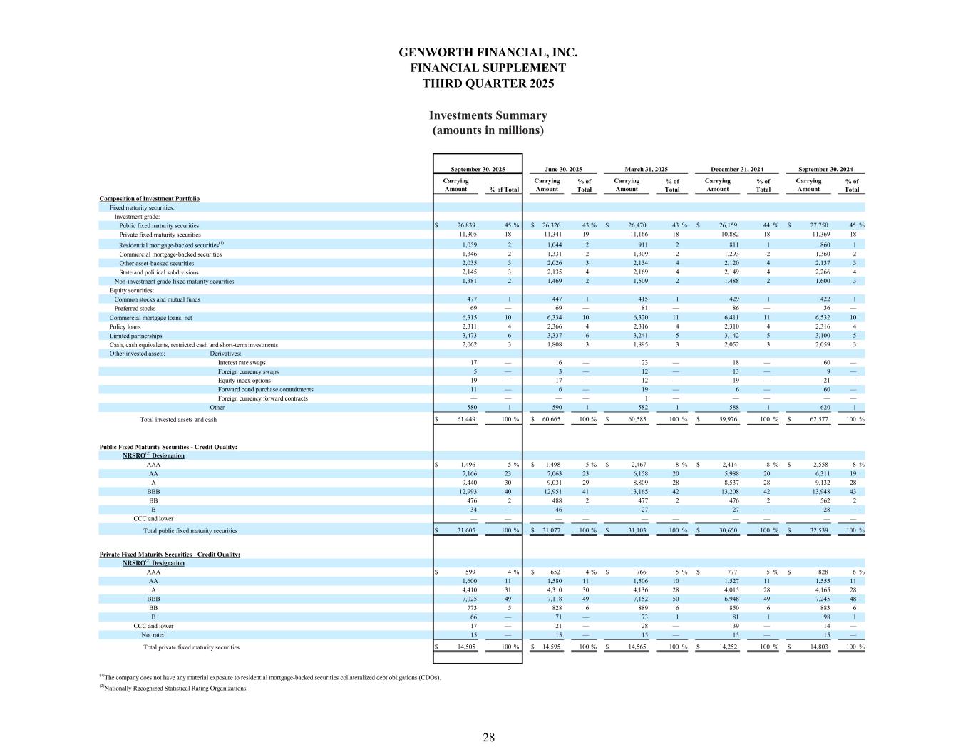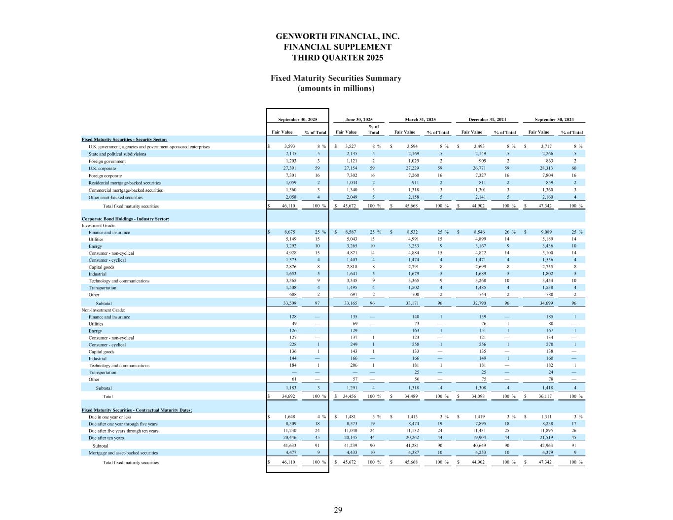 Carrying Amount Carrying Amount Carrying Amount Carrying Amount Carrying Amount $ 26,839 45 % $ 26,326 43 % $ 26,470 43 % $ 26,159 44 % $ 27,750 45 % 11,305 18 11,341 19 11,166 18 10,882 18 11,369 18 1,059 2 1,044 2 911 2 811 1 860 1 1,346 2 1,331 2 1,309 2 1,293 2 1,360 2 2,035 3 2,026 3 2,134 4 2,120 4 2,137 3 2,145 3 2,135 4 2,169 4 2,149 4 2,266 4 1,381 2 1,469 2 1,509 2 1,488 2 1,600 3 477 1 447 1 415 1 429 1 422 1 69 — 69 — 81 — 86 — 36 — 6,315 10 6,334 10 6,320 11 6,411 11 6,532 10 2,311 4 2,366 4 2,316 4 2,310 4 2,316 4 3,473 6 3,337 6 3,241 5 3,142 5 3,100 5 2,062 3 1,808 3 1,895 3 2,052 3 2,059 3 Other invested assets: Derivatives: Interest rate swaps 17 — 16 — 23 — 18 — 60 — Foreign currency swaps 5 — 3 — 12 — 13 — 9 — Equity index options 19 — 17 — 12 — 19 — 21 — Forward bond purchase commitments 11 — 6 — 19 — 6 — 60 — Foreign currency forward contracts — — — — 1 — — — — — Other 580 1 590 1 582 1 588 1 620 1 $ 61,449 100 % $ 60,665 100 % $ 60,585 100 % $ 59,976 100 % $ 62,577 100 % NRSRO(2) Designation AAA $ 1,496 5 % $ 1,498 5 % $ 2,467 8 % $ 2,414 8 % $ 2,558 8 % AA 7,166 23 7,063 23 6,158 20 5,988 20 6,311 19 A 9,440 30 9,031 29 8,809 28 8,537 28 9,132 28 BBB 12,993 40 12,951 41 13,165 42 13,208 42 13,948 43 BB 476 2 488 2 477 2 476 2 562 2 B 34 — 46 — 27 — 27 — 28 — CCC and lower — — — — — — — — — — $ 31,605 100 % $ 31,077 100 % $ 31,103 100 % $ 30,650 100 % $ 32,539 100 % NRSRO(2) Designation AAA $ 599 4 % $ 652 4 % $ 766 5 % $ 777 5 % $ 828 6 % AA 1,600 11 1,580 11 1,506 10 1,527 11 1,555 11 A 4,410 31 4,310 30 4,136 28 4,015 28 4,165 28 BBB 7,025 49 7,118 49 7,152 50 6,948 49 7,245 48 BB 773 5 828 6 889 6 850 6 883 6 B 66 — 71 — 73 1 81 1 98 1 CCC and lower 17 — 21 — 28 — 39 — 14 — Not rated 15 — 15 — 15 — 15 — 15 — $ 14,505 100 % $ 14,595 100 % $ 14,565 100 % $ 14,252 100 % $ 14,803 100 % March 31, 2025 % of Total % of Total September 30, 2025 % of Total Private fixed maturity securities Residential mortgage-backed securities(1) Commercial mortgage-backed securities Other asset-backed securities June 30, 2025 Composition of Investment Portfolio Fixed maturity securities: Investment grade: Public Fixed Maturity Securities - Credit Quality: % of Total December 31, 2024 September 30, 2024 % of Total Commercial mortgage loans, net Policy loans Limited partnerships Cash, cash equivalents, restricted cash and short-term investments Total invested assets and cash State and political subdivisions Non-investment grade fixed maturity securities Equity securities: Common stocks and mutual funds Preferred stocks Public fixed maturity securities Total public fixed maturity securities Private Fixed Maturity Securities - Credit Quality: Total private fixed maturity securities GENWORTH FINANCIAL, INC. FINANCIAL SUPPLEMENT THIRD QUARTER 2025 Investments Summary (amounts in millions) 28 (1) (2) The company does not have any material exposure to residential mortgage-backed securities collateralized debt obligations (CDOs). Nationally Recognized Statistical Rating Organizations.