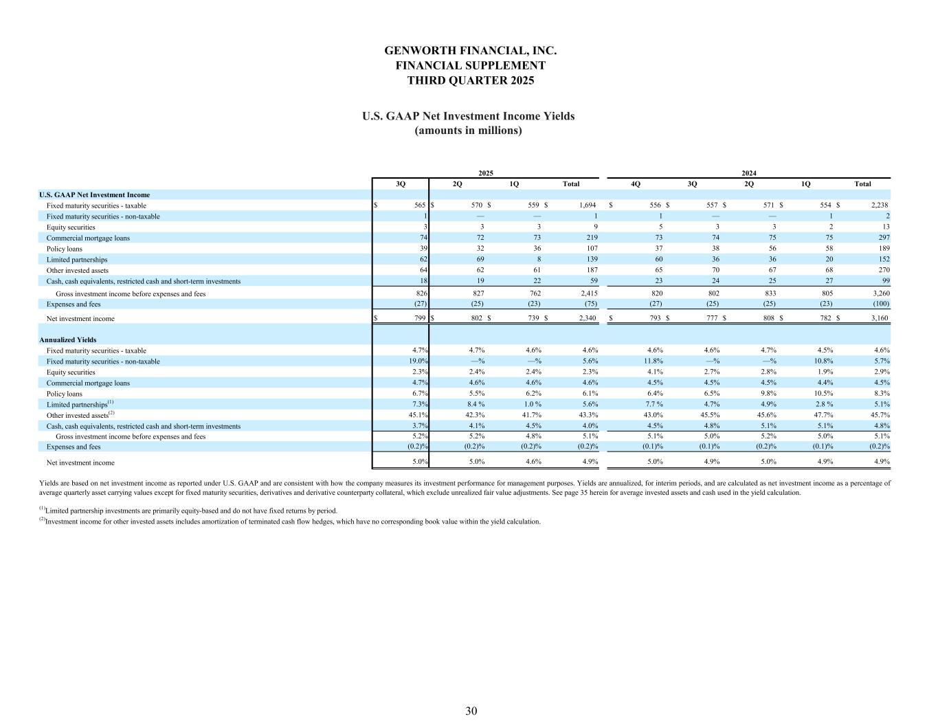 3Q 2Q 1Q Total 4Q 3Q 2Q 1Q Total $ 565 $ 570 $ 559 $ 1,694 $ 556 $ 557 $ 571 $ 554 $ 2,238 1 — — 1 1 — — 1 2 3 3 3 9 5 3 3 2 13 74 72 73 219 73 74 75 75 297 39 32 36 107 37 38 56 58 189 62 69 8 139 60 36 36 20 152 64 62 61 187 65 70 67 68 270 18 19 22 59 23 24 25 27 99 826 827 762 2,415 820 802 833 805 3,260 (27) (25) (23) (75) (27) (25) (25) (23) (100) $ 799 $ 802 $ 739 $ 2,340 $ 793 $ 777 $ 808 $ 782 $ 3,160 4.7% 4.7% 4.6% 4.6% 4.6% 4.6% 4.7% 4.5% 4.6% 19.0% —% —% 5.6% 11.8% —% —% 10.8% 5.7% 2.3% 2.4% 2.4% 2.3% 4.1% 2.7% 2.8% 1.9% 2.9% 4.7% 4.6% 4.6% 4.6% 4.5% 4.5% 4.5% 4.4% 4.5% 6.7% 5.5% 6.2% 6.1% 6.4% 6.5% 9.8% 10.5% 8.3% 7.3% 8.4 % 1.0 % 5.6% 7.7 % 4.7% 4.9% 2.8 % 5.1% 45.1% 42.3% 41.7% 43.3% 43.0% 45.5% 45.6% 47.7% 45.7% 3.7% 4.1% 4.5% 4.0% 4.5% 4.8% 5.1% 5.1% 4.8% 5.2% 5.2% 4.8% 5.1% 5.1% 5.0% 5.2% 5.0% 5.1% (0.2)% (0.2)% (0.2)% (0.2)% (0.1)% (0.1)% (0.2)% (0.1)% (0.2)% 5.0% 5.0% 4.6% 4.9% 5.0% 4.9% 5.0% 4.9% 4.9% (2)Investment income for other invested assets includes amortization of terminated cash flow hedges, which have no corresponding book value within the yield calculation. (1)Limited partnership investments are primarily equity-based and do not have fixed returns by period. Yields are based on net investment income as reported under U.S. GAAP and are consistent with how the company measures its investment performance for management purposes. Yields are annualized, for interim periods, and are calculated as net investment income as a percentage of average quarterly asset carrying values except for fixed maturity securities, derivatives and derivative counterparty collateral, which exclude unrealized fair value adjustments. See page 35 herein for average invested assets and cash used in the yield calculation. Limited partnerships(1) Other invested assets(2) Gross investment income before expenses and fees Cash, cash equivalents, restricted cash and short-term investments Net investment income Expenses and fees Annualized Yields Fixed maturity securities - taxable Equity securities Fixed maturity securities - non-taxable Policy loans Commercial mortgage loans Limited partnerships Other invested assets Gross investment income before expenses and fees Cash, cash equivalents, restricted cash and short-term investments Net investment income Expenses and fees 2024 Policy loans Commercial mortgage loans U.S. GAAP Net Investment Income Fixed maturity securities - taxable Equity securities Fixed maturity securities - non-taxable 2025 GENWORTH FINANCIAL, INC. FINANCIAL SUPPLEMENT THIRD QUARTER 2025 U.S. GAAP Net Investment Income Yields (amounts in millions) 30