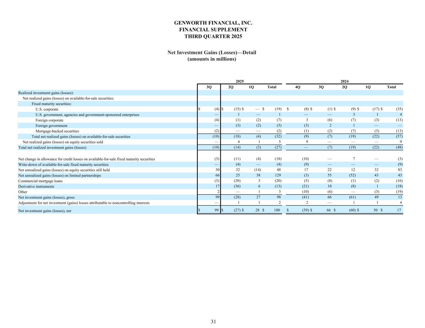 3Q 2Q 1Q Total 4Q 3Q 2Q 1Q Total $ (4) $ (15) $ — $ (19) $ (8) $ (1) $ (9) $ (17) $ (35) — 1 — 1 — — 3 1 4 (4) (1) (2) (7) 3 (6) (7) (3) (13) — (3) (2) (5) (3) 2 1 — — (2) — — (2) (1) (2) (7) (3) (13) Total net realized gains (losses) on available-for-sale securities (10) (18) (4) (32) (9) (7) (19) (22) (57) — 4 1 5 9 — — — 9 (10) (14) (3) (27) — (7) (19) (22) (48) (3) (11) (4) (18) (10) — 7 — (3) — (4) — (4) (9) — — — (9) 30 32 (14) 48 17 22 12 32 83 66 25 38 129 (3) 55 (52) 43 43 (3) (20) 3 (20) (5) (8) (1) (2) (16) 17 (36) 6 (13) (21) 10 (8) 1 (18) 2 — 1 3 (10) (6) — (3) (19) 99 (28) 27 98 (41) 66 (61) 49 13 — 1 1 2 2 — 1 1 4 $ 99 $ (27) $ 28 $ 100 $ (39) $ 66 $ (60) $ 50 $ 17 Net investment gains (losses), gross Net investment gains (losses), net Adjustment for net investment (gains) losses attributable to noncontrolling interests Net change in allowance for credit losses on available-for-sale fixed maturity securities Write-down of available-for-sale fixed maturity securities Net unrealized gains (losses) on limited partnerships Net unrealized gains (losses) on equity securities still held Derivative instruments Commercial mortgage loans Foreign government Mortgage-backed securities Total net realized investment gains (losses) Net realized gains (losses) on equity securities sold Other 2024 Foreign corporate U.S. government, agencies and government-sponsored enterprises Realized investment gains (losses): Net realized gains (losses) on available-for-sale securities: U.S. corporate Fixed maturity securities: 2025 GENWORTH FINANCIAL, INC. FINANCIAL SUPPLEMENT THIRD QUARTER 2025 Net Investment Gains (Losses)—Detail (amounts in millions) 31