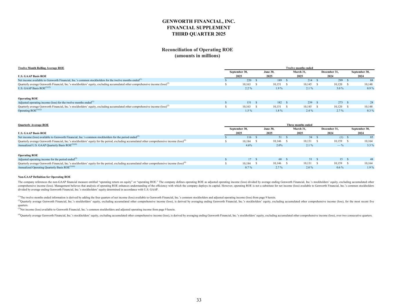 September 30, June 30, March 31, December 31, September 30, 2025 2025 2025 2024 2024 $ 220 $ 189 $ 214 $ 299 $ 88 $ 10,163 $ 10,151 $ 10,145 $ 10,120 $ 10,148 2.2 % 1.9 % 2.1 % 3.0 % 0.9 % $ 151 $ 182 $ 239 $ 273 $ 28 $ 10,163 $ 10,151 $ 10,145 $ 10,120 $ 10,148 1.5 % 1.8 % 2.4 % 2.7 % 0.3 % September 30, June 30, March 31, December 31, September 30, 2025 2025 2025 2024 2024 $ 116 $ 51 $ 54 $ (1) $ 85 $ 10,184 $ 10,146 $ 10,131 $ 10,159 $ 10,164 4.6% 2.0% 2.1 % — % 3.3 % $ 17 $ 68 $ 51 $ 15 $ 48 $ 10,184 $ 10,146 $ 10,131 $ 10,159 $ 10,164 0.7 % 2.7 % 2.0 % 0.6 % 1.9 % Twelve months ended Three months ended Operating ROE(1)/(2) Quarterly average Genworth Financial, Inc.’s stockholders’ equity, excluding accumulated other comprehensive income (loss)(2) Operating ROE Adjusted operating income (loss) for the twelve months ended(1) Quarterly Average ROE Twelve Month Rolling Average ROE Quarterly average Genworth Financial, Inc.’s stockholders’ equity, excluding accumulated other comprehensive income (loss)(2) U.S. GAAP Basis ROE(1)/(2) Net income available to Genworth Financial, Inc.’s common stockholders for the twelve months ended(1) U.S. GAAP Basis ROE U.S. GAAP Basis ROE Net income (loss) available to Genworth Financial, Inc.’s common stockholders for the period ended(3) Operating ROE Adjusted operating income for the period ended(3) Annualized U.S. GAAP Quarterly Basis ROE(3)/(4) Quarterly average Genworth Financial, Inc.’s stockholders’ equity for the period, excluding accumulated other comprehensive income (loss)(4) Non-GAAP Definition for Operating ROE The company references the non-GAAP financial measure entitled “operating return on equity” or “operating ROE.” The company defines operating ROE as adjusted operating income (loss) divided by average ending Genworth Financial, Inc.’s stockholders’ equity, excluding accumulated other comprehensive income (loss). Management believes that analysis of operating ROE enhances understanding of the efficiency with which the company deploys its capital. However, operating ROE is not a substitute for net income (loss) available to Genworth Financial, Inc.’s common stockholders divided by average ending Genworth Financial, Inc.’s stockholders’ equity determined in accordance with U.S. GAAP. Quarterly average Genworth Financial, Inc.’s stockholders’ equity for the period, excluding accumulated other comprehensive income (loss)(4) Annualized Operating Quarterly Basis ROE(3)/(4) (4)Quarterly average Genworth Financial, Inc.’s stockholders’ equity, excluding accumulated other comprehensive income (loss), is derived by averaging ending Genworth Financial, Inc.’s stockholders’ equity, excluding accumulated other comprehensive income (loss), over two consecutive quarters. (3)Net income (loss) available to Genworth Financial, Inc.’s common stockholders and adjusted operating income from page 9 herein. (2)Quarterly average Genworth Financial, Inc.’s stockholders’ equity, excluding accumulated other comprehensive income (loss), is derived by averaging ending Genworth Financial, Inc.’s stockholders’ equity, excluding accumulated other comprehensive income (loss), for the most recent five quarters. (1)The twelve months ended information is derived by adding the four quarters of net income (loss) available to Genworth Financial, Inc.’s common stockholders and adjusted operating income (loss) from page 9 herein. GENWORTH FINANCIAL, INC. FINANCIAL SUPPLEMENT THIRD QUARTER 2025 Reconciliation of Operating ROE (amounts in millions) 33