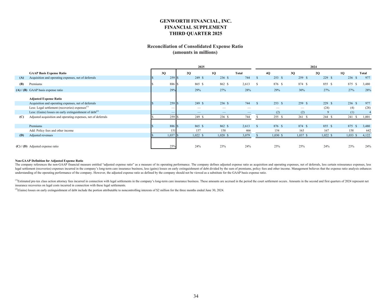 GAAP Basis Expense Ratio 3Q 2Q 1Q Total 4Q 3Q 2Q 1Q Total (A) Acquisition and operating expenses, net of deferrals $ 259 $ 249 $ 236 $ 744 $ 253 $ 259 $ 229 $ 236 $ 977 (B) Premiums $ 886 $ 865 $ 862 $ 2,613 $ 876 $ 874 $ 855 $ 875 $ 3,480 (A) / (B) GAAP basis expense ratio 29% 29% 27% 28% 29% 30% 27% 27% 28% Adjusted Expense Ratio Acquisition and operating expenses, net of deferrals $ 259 $ 249 $ 236 $ 744 $ 253 $ 259 $ 229 $ 236 $ 977 Less: Legal settlement (recoveries) expenses(1) — — — — — — (24) (4) (28) Less: (Gains) losses on early extinguishment of debt(2) — — — — (2) (2) 9 (1) 4 (C) Adjusted acquisition and operating expenses, net of deferrals $ 259 $ 249 $ 236 $ 744 $ 255 $ 261 $ 244 $ 241 $ 1,001 Premiums $ 886 $ 865 $ 862 $ 2,613 $ 876 $ 874 $ 855 $ 875 $ 3,480 Add: Policy fees and other income 151 157 158 466 154 163 167 158 642 (D) Adjusted revenues $ 1,037 $ 1,022 $ 1,020 $ 3,079 $ 1,030 $ 1,037 $ 1,022 $ 1,033 $ 4,122 (C) / (D) Adjusted expense ratio 25% 24% 23% 24% 25% 25% 24% 23% 24% 2025 2024 GENWORTH FINANCIAL, INC. FINANCIAL SUPPLEMENT THIRD QUARTER 2025 Reconciliation of Consolidated Expense Ratio (amounts in millions) 34 Non-GAAP Definition for Adjusted Expense Ratio The company references the non-GAAP financial measure entitled “adjusted expense ratio” as a measure of its operating performance. The company defines adjusted expense ratio as acquisition and operating expenses, net of deferrals, less certain reinsurance expenses, less legal settlement (recoveries) expenses incurred in the company’s long-term care insurance business, less (gains) losses on early extinguishment of debt divided by the sum of premiums, policy fees and other income. Management believes that the expense ratio analysis enhances understanding of the operating performance of the company. However, the adjusted expense ratio as defined by the company should not be viewed as a substitute for the GAAP basis expense ratio. (1)Estimated pre-tax class action attorney fees incurred in connection with legal settlements in the company’s long-term care insurance business. These amounts are accrued in the period the court settlement occurs. Amounts in the second and first quarters of 2024 represent net insurance recoveries on legal costs incurred in connection with these legal settlements. (2)(Gains) losses on early extinguishment of debt include the portion attributable to noncontrolling interests of $2 million for the three months ended June 30, 2024.