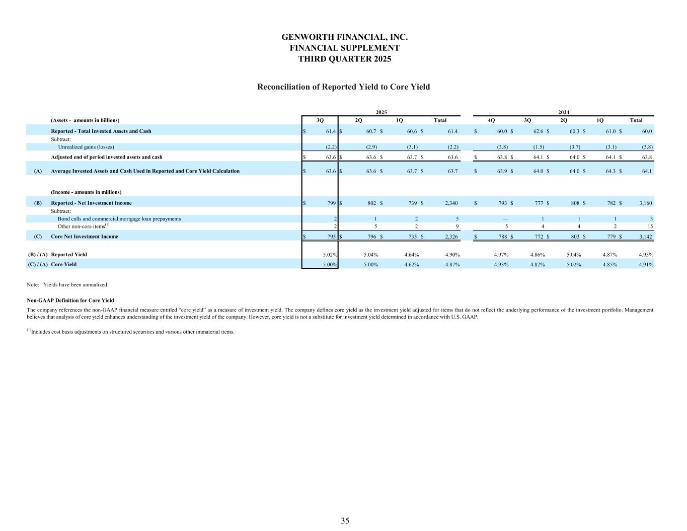 (Assets - amounts in billions) 3Q 2Q 1Q Total 4Q 3Q 2Q 1Q Total Reported - Total Invested Assets and Cash $ 61.4 $ 60.7 $ 60.6 $ 61.4 $ 60.0 $ 62.6 $ 60.3 $ 61.0 $ 60.0 Subtract: Unrealized gains (losses) (2.2) (2.9) (3.1) (2.2) (3.8) (1.5) (3.7) (3.1) (3.8) Adjusted end of period invested assets and cash $ 63.6 $ 63.6 $ 63.7 $ 63.6 $ 63.8 $ 64.1 $ 64.0 $ 64.1 $ 63.8 (A) Average Invested Assets and Cash Used in Reported and Core Yield Calculation $ 63.6 $ 63.6 $ 63.7 $ 63.7 $ 63.9 $ 64.0 $ 64.0 $ 64.3 $ 64.1 (Income - amounts in millions) (B) Reported - Net Investment Income $ 799 $ 802 $ 739 $ 2,340 $ 793 $ 777 $ 808 $ 782 $ 3,160 Subtract: Bond calls and commercial mortgage loan prepayments 2 1 2 5 — 1 1 1 3 Other non-core items(1) 2 5 2 9 5 4 4 2 15 (C) Core Net Investment Income $ 795 $ 796 $ 735 $ 2,326 $ 788 $ 772 $ 803 $ 779 $ 3,142 (B) / (A) Reported Yield 5.02% 5.04% 4.64% 4.90% 4.97% 4.86% 5.04% 4.87% 4.93% (C) / (A) Core Yield 5.00% 5.00% 4.62% 4.87% 4.93% 4.82% 5.02% 4.85% 4.91% 2025 2024 GENWORTH FINANCIAL, INC. FINANCIAL SUPPLEMENT THIRD QUARTER 2025 35 Reconciliation of Reported Yield to Core Yield Note: Yields have been annualized. Non-GAAP Definition for Core Yield The company references the non-GAAP financial measure entitled “core yield” as a measure of investment yield. The company defines core yield as the investment yield adjusted for items that do not reflect the underlying performance of the investment portfolio. Management believes that analysis of core yield enhances understanding of the investment yield of the company. However, core yield is not a substitute for investment yield determined in accordance with U.S. GAAP. (1)Includes cost basis adjustments on structured securities and various other immaterial items.