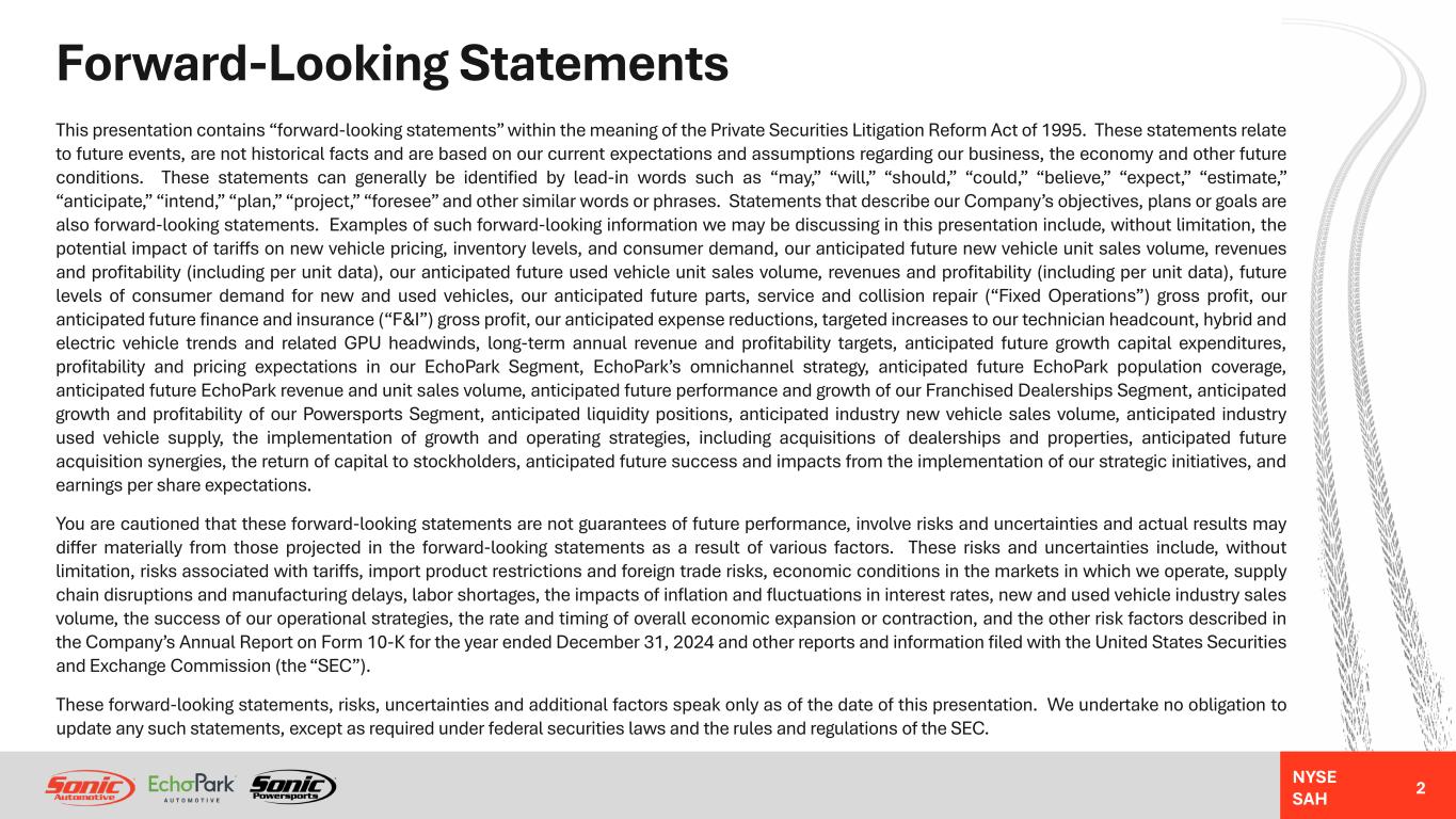 NYSE SAH Forward-Looking Statements This presentation contains “forward-looking statements” within the meaning of the Private Securities Litigation Reform Act of 1995. These statements relate to future events, are not historical facts and are based on our current expectations and assumptions regarding our business, the economy and other future conditions. These statements can generally be identified by lead-in words such as “may,” “will,” “should,” “could,” “believe,” “expect,” “estimate,” “anticipate,” “intend,” “plan,” “project,” “foresee” and other similar words or phrases. Statements that describe our Company’s objectives, plans or goals are also forward-looking statements. Examples of such forward-looking information we may be discussing in this presentation include, without limitation, the potential impact of tariffs on new vehicle pricing, inventory levels, and consumer demand, our anticipated future new vehicle unit sales volume, revenues and profitability (including per unit data), our anticipated future used vehicle unit sales volume, revenues and profitability (including per unit data), future levels of consumer demand for new and used vehicles, our anticipated future parts, service and collision repair (“Fixed Operations”) gross profit, our anticipated future finance and insurance (“F&I”) gross profit, our anticipated expense reductions, targeted increases to our technician headcount, hybrid and electric vehicle trends and related GPU headwinds, long-term annual revenue and profitability targets, anticipated future growth capital expenditures, profitability and pricing expectations in our EchoPark Segment, EchoPark’s omnichannel strategy, anticipated future EchoPark population coverage, anticipated future EchoPark revenue and unit sales volume, anticipated future performance and growth of our Franchised Dealerships Segment, anticipated growth and profitability of our Powersports Segment, anticipated liquidity positions, anticipated industry new vehicle sales volume, anticipated industry used vehicle supply, the implementation of growth and operating strategies, including acquisitions of dealerships and properties, anticipated future acquisition synergies, the return of capital to stockholders, anticipated future success and impacts from the implementation of our strategic initiatives, and earnings per share expectations. You are cautioned that these forward-looking statements are not guarantees of future performance, involve risks and uncertainties and actual results may differ materially from those projected in the forward-looking statements as a result of various factors. These risks and uncertainties include, without limitation, risks associated with tariffs, import product restrictions and foreign trade risks, economic conditions in the markets in which we operate, supply chain disruptions and manufacturing delays, labor shortages, the impacts of inflation and fluctuations in interest rates, new and used vehicle industry sales volume, the success of our operational strategies, the rate and timing of overall economic expansion or contraction, and the other risk factors described in the Company’s Annual Report on Form 10-K for the year ended December 31, 2024 and other reports and information filed with the United States Securities and Exchange Commission (the “SEC”). These forward-looking statements, risks, uncertainties and additional factors speak only as of the date of this presentation. We undertake no obligation to update any such statements, except as required under federal securities laws and the rules and regulations of the SEC. 2