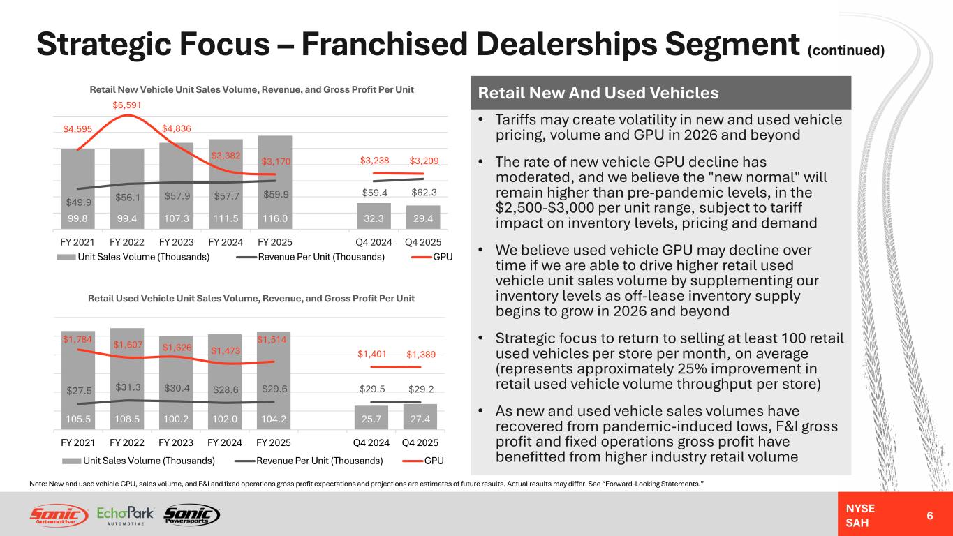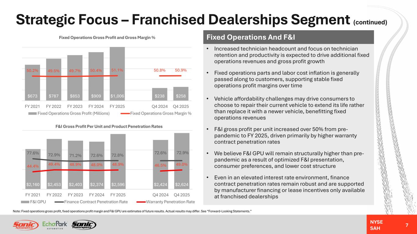 NYSE SAH Strategic Focus – Franchised Dealerships Segment (continued) 6 99.8 99.4 107.3 111.5 116.0 32.3 29.4 $49.9 $56.1 $57.9 $57.7 $59.9 $59.4 $62.3 $4,595 $6,591 $4,836 $3,382 $3,170 $3,238 $3,209 FY 2021 FY 2022 FY 2023 FY 2024 FY 2025 Q4 2024 Q4 2025 Retail New Vehicle Unit Sales Volume, Revenue, and Gross Profit Per Unit Unit Sales Volume (Thousands) Revenue Per Unit (Thousands) GPU 105.5 108.5 100.2 102.0 104.2 25.7 27.4 $27.5 $31.3 $30.4 $28.6 $29.6 $29.5 $29.2 $1,784 $1,607 $1,626 $1,473 $1,514 $1,401 $1,389 FY 2021 FY 2022 FY 2023 FY 2024 FY 2025 Q4 2024 Q4 2025 Retail Used Vehicle Unit Sales Volume, Revenue, and Gross Profit Per Unit Unit Sales Volume (Thousands) Revenue Per Unit (Thousands) GPU Retail New And Used Vehicles • Tariffs may create volatility in new and used vehicle pricing, volume and GPU in 2026 and beyond • The rate of new vehicle GPU decline has moderated, and we believe the "new normal" will remain higher than pre-pandemic levels, in the $2,500-$3,000 per unit range, subject to tariff impact on inventory levels, pricing and demand • We believe used vehicle GPU may decline over time if we are able to drive higher retail used vehicle unit sales volume by supplementing our inventory levels as off-lease inventory supply begins to grow in 2026 and beyond • Strategic focus to return to selling at least 100 retail used vehicles per store per month, on average (represents approximately 25% improvement in retail used vehicle volume throughput per store) • As new and used vehicle sales volumes have recovered from pandemic-induced lows, F&I gross profit and fixed operations gross profit have benefitted from higher industry retail volume Note: New and used vehicle GPU, sales volume, and F&I and fixed operations gross profit expectations and projections are estimates of future results. Actual results may differ. See “Forward-Looking Statements.”