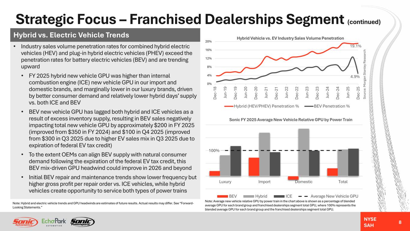 NYSE SAH Strategic Focus – Franchised Dealerships Segment (continued) 7 Fixed Operations And F&I • Increased technician headcount and focus on technician retention and productivity is expected to drive additional fixed operations revenues and gross profit growth • Fixed operations parts and labor cost inflation is generally passed along to customers, supporting stable fixed operations profit margins over time • Vehicle affordability challenges may drive consumers to choose to repair their current vehicle to extend its life rather than replace it with a newer vehicle, benefitting fixed operations revenues • F&I gross profit per unit increased over 50% from pre- pandemic to FY 2025, driven primarily by higher warranty contract penetration rates • We believe F&I GPU will remain structurally higher than pre- pandemic as a result of optimized F&I presentation, consumer preferences, and lower cost structure • Even in an elevated interest rate environment, finance contract penetration rates remain robust and are supported by manufacturer financing or lease incentives only available at franchised dealerships $2,160 $2,453 $2,403 $2,374 $2,596 $2,424 $2,624 77.6% 72.9% 71.2% 72.6% 72.8% 72.6% 72.9% 44.4% 49.4% 48.9% 48.0% 48.9% 46.5% 49.0% FY 2021 FY 2022 FY 2023 FY 2024 FY 2025 Q4 2024 Q4 2025 F&I Gross Profit Per Unit and Product Penetration Rates F&I GPU Finance Contract Penetration Rate Warranty Penetration Rate Note: Fixed operations gross profit, fixed operations profit margin and F&I GPU are estimates of future results. Actual results may differ. See “Forward-Looking Statements.” $673 $787 $853 $909 $1,006 $238 $258 50.2% 49.5% 49.7% 50.4% 51.1% 50.8% 50.9% FY 2021 FY 2022 FY 2023 FY 2024 FY 2025 Q4 2024 Q4 2025 Fixed Operations Gross Profit and Gross Margin % Fixed Operations Gross Profit (Millions) Fixed Operations Gross Margin %