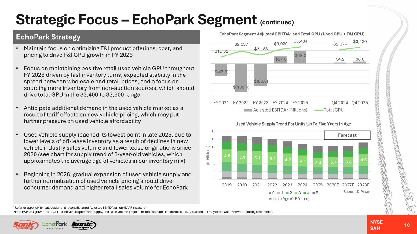 NYSE SAH Strategic Focus – EchoPark Segment • FY 2025 EchoPark Segment adjusted EBITDA* of $49.2 million, up 78% year- over-year • Returned to positive segment adjusted EBITDA* in FY 2024 after 3 years of used vehicle industry headwinds • Expect to resume disciplined expansion of EchoPark footprint in late 2026 once used vehicle market conditions are supportive • Long-term goal to reach 90% of the U.S. population • Below-market pricing and no-haggle, transparent guest experience expected to drive market share gains • EchoPark maintains the #1 ranking in guest satisfaction among all major pre- owned vehicle retailers according to Reputation.com EchoPark Strategy * Refer to appendix for calculation and reconciliation of Adjusted EBITDA (a non-GAAP measure). Note: “EchoPark Operations” chart data includes currently operating stores and corporate/holding company results. “Closed Stores” chart data includes results from stores that are not currently in operation as of the date of this presentation. $(27.0) $(70.1) $(49.5) $32.5 $48.3 $5.0 $8.4 $(19.3) $(35.3) $(33.5) $(4.9) $0.9 $(0.8) $0.4 $(120) $(80) $(40) $- $40 FY 2021 FY 2022 FY 2023 FY 2024 FY 2025 Q4 2024 Q4 2025 EchoPark Segment Adjusted EBITDA* (Millions) EchoPark Operations (with Holding Company) Closed Stores 203 111 164 268 313 309 292 77,835 64,107 73,676 69,053 67,636 16,674 15,743 - 200 400 600 800 1,000 FY 2021 FY 2022 FY 2023 FY 2024 FY 2025 Q4 2024 Q4 2025 M on th ly V ol um e Pe r S to re EchoPark Segment Retail Unit Sales Volume Average Monthly Unit Volume Per Store Used Retail Unit Sales Volume 9