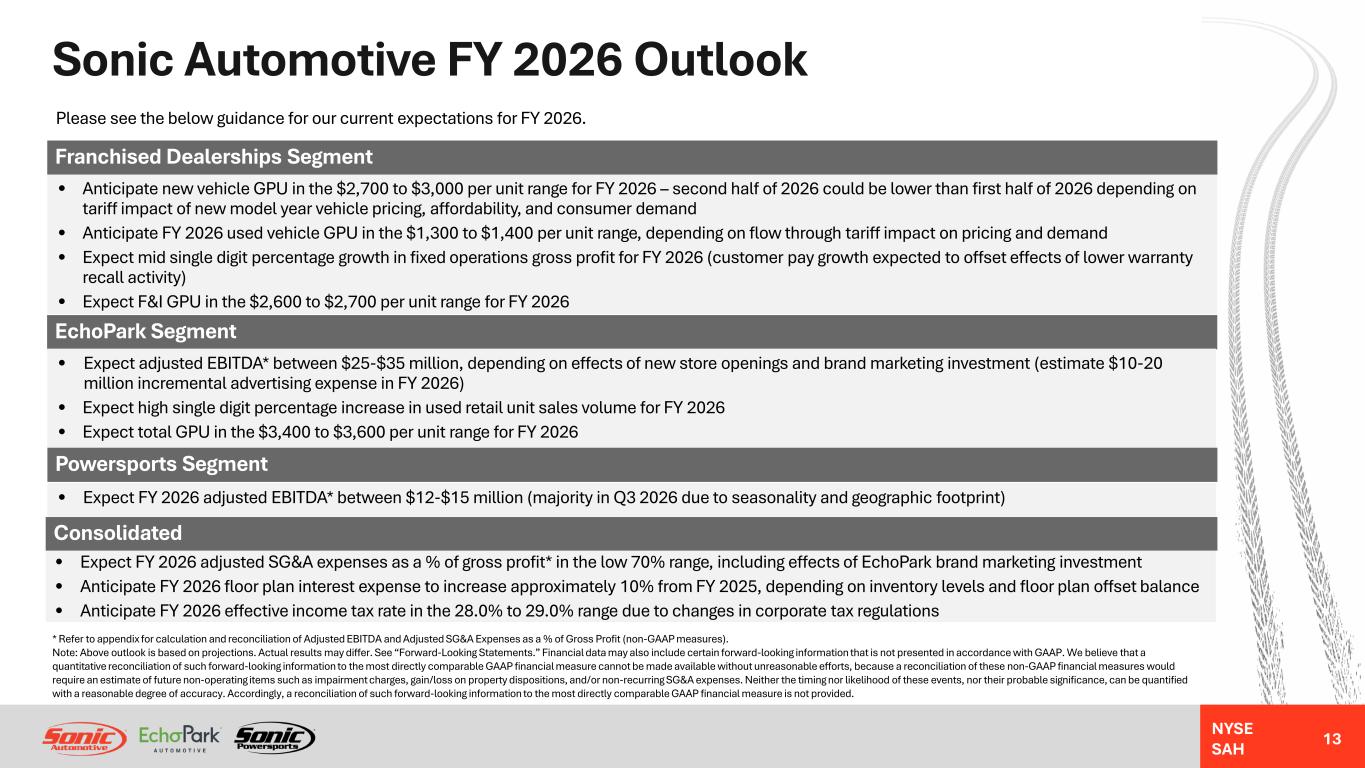NYSE SAH Sonic Automotive FY 2026 Outlook • Anticipate new vehicle GPU in the $2,700 to $3,000 per unit range for FY 2026 – second half of 2026 could be lower than first half of 2026 depending on tariff impact of new model year vehicle pricing, affordability, and consumer demand • Anticipate FY 2026 used vehicle GPU in the $1,300 to $1,400 per unit range, depending on flow through tariff impact on pricing and demand • Expect mid single digit percentage growth in fixed operations gross profit for FY 2026 (customer pay growth expected to offset effects of lower warranty recall activity) • Expect F&I GPU in the $2,600 to $2,700 per unit range for FY 2026 Consolidated • Expect FY 2026 adjusted SG&A expenses as a % of gross profit* in the low 70% range, including effects of EchoPark brand marketing investment • Anticipate FY 2026 floor plan interest expense to increase approximately 10% from FY 2025, depending on inventory levels and floor plan offset balance • Anticipate FY 2026 effective income tax rate in the 28.0% to 29.0% range due to changes in corporate tax regulations Franchised Dealerships Segment EchoPark Segment • Expect adjusted EBITDA* between $25-$35 million, depending on effects of new store openings and brand marketing investment (estimate $10-20 million incremental advertising expense in FY 2026) • Expect high single digit percentage increase in used retail unit sales volume for FY 2026 • Expect total GPU in the $3,400 to $3,600 per unit range for FY 2026 Powersports Segment • Expect FY 2026 adjusted EBITDA* between $12-$15 million (majority in Q3 2026 due to seasonality and geographic footprint) * Refer to appendix for calculation and reconciliation of Adjusted EBITDA and Adjusted SG&A Expenses as a % of Gross Profit (non-GAAP measures). Note: Above outlook is based on projections. Actual results may differ. See “Forward-Looking Statements.” Financial data may also include certain forward-looking information that is not presented in accordance with GAAP. We believe that a quantitative reconciliation of such forward-looking information to the most directly comparable GAAP financial measure cannot be made available without unreasonable efforts, because a reconciliation of these non-GAAP financial measures would require an estimate of future non-operating items such as impairment charges, gain/loss on property dispositions, and/or non-recurring SG&A expenses. Neither the timing nor likelihood of these events, nor their probable significance, can be quantified with a reasonable degree of accuracy. Accordingly, a reconciliation of such forward-looking information to the most directly comparable GAAP financial measure is not provided. 13 Please see the below guidance for our current expectations for FY 2026.