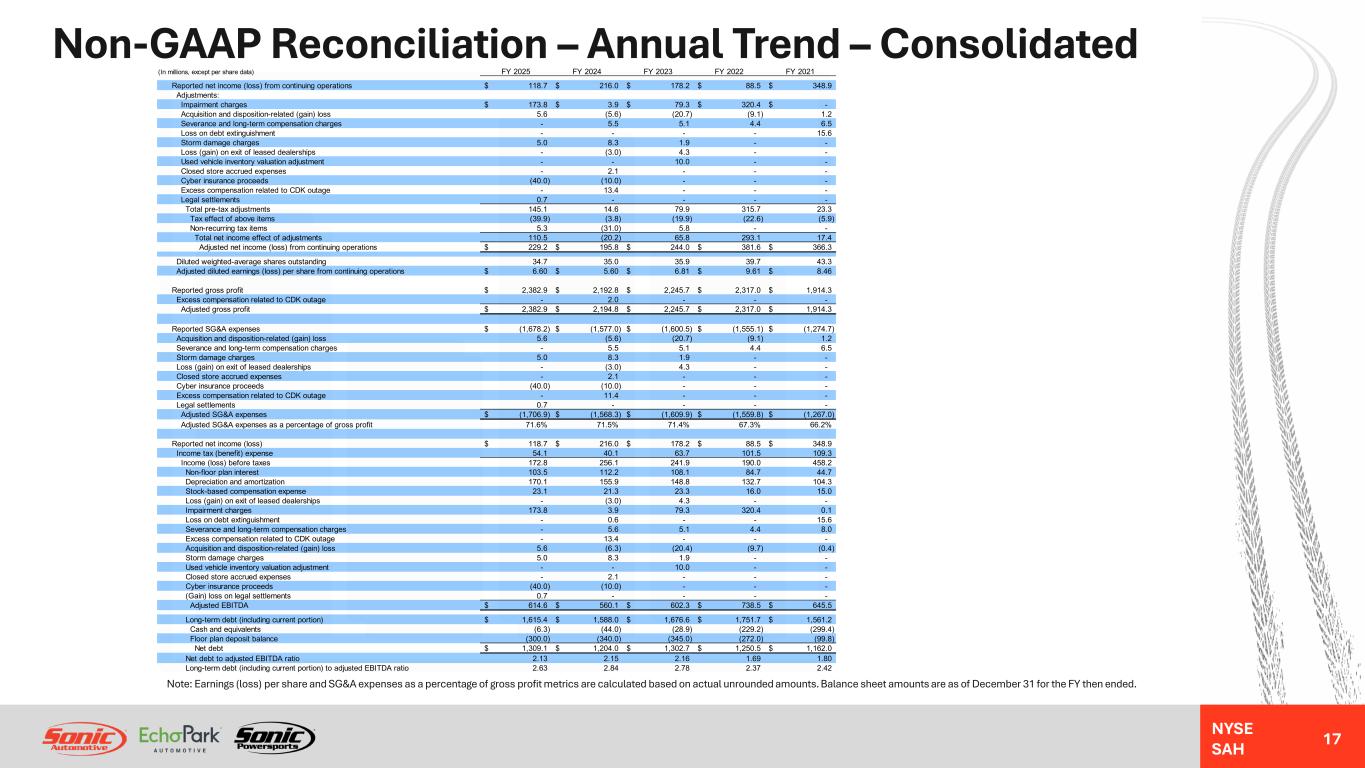 NYSE SAH GAAP Income Statement – Annual Trend – Consolidated 16 NM = Not MeaningfulNote: Earnings (loss) per share and gross profit per unit metrics are calculated based on actual unrounded amounts. FY 2025 Better / (Worse) % Change (In millions, except unit, per unit, and per share data) FY 2025 FY 2024 FY 2023 FY 2022 FY 2021 Year-Over-Year Revenues: Retail new vehicles 7,047.4$ 6,507.5$ 6,304.6$ 5,622.6$ 4,993.4$ 8% Fleet new vehicles 101.5 95.3 92.2 99.4 124.6 NM Total new vehicles 7,148.9 6,602.8 6,396.8 5,722.0 5,118.0 8% Used vehicles 4,872.6 4,780.1 5,213.6 5,515.4 4,933.6 2% Wholesale vehicles 314.1 287.1 318.8 484.9 367.2 NM Total vehicles 12,335.6 11,670.0 11,929.2 11,722.3 10,418.8 6% Parts, service and collision repair 2,019.1 1,846.5 1,759.5 1,599.7 1,340.4 9% Finance, insurance and other, net ("F&I") 798.9 707.8 683.7 679.1 637.2 13% Total revenues 15,153.6 14,224.3 14,372.4 14,001.1 12,396.4 7% Gross profit: Retail new vehicles 383.3 388.4 535.4 662.8 459.8 (1%) Fleet new vehicles 1.7 3.0 4.0 4.9 1.6 NM Total new vehicles 385.0 391.4 539.4 667.7 461.4 (2%) Used vehicles 181.1 170.7 151.2 180.8 133.0 6% Wholesale vehicles (11.2) (6.0) (2.6) (3.1) 9.6 NM Total vehicles 554.9 556.1 688.0 845.4 604.0 0% Parts, service and collision repair 1,029.1 928.9 874.0 792.5 673.1 11% Finance, insurance and other, net 798.9 707.8 683.7 679.1 637.2 13% Total gross profit 2,382.9 2,192.8 2,245.7 2,317.0 1,914.3 9% SG&A expenses (1,678.2) (1,577.0) (1,600.5) (1,555.1) (1,274.7) (6%) Impairment charges (173.8) (3.9) (79.3) (320.4) (0.1) NM Depreciation and amortization (163.4) (150.4) (142.3) (127.5) (101.1) (9%) Operating income (loss) 367.5 461.5 423.6 314.0 538.4 (20%) Interest expense, floor plan (84.7) (86.9) (67.2) (34.3) (16.7) 3% Interest expense, other, net (110.1) (118.0) (114.6) (89.9) (48.0) 7% Other income (expense), net 0.1 (0.5) 0.1 0.2 (15.5) NM Income (loss) from continuing operations before taxes 172.8 256.1 241.9 190.0 458.2 (33%) Income tax benefit (expense) (54.1) (40.1) (63.7) (101.5) (109.3) (35%) Net income (loss) from continuing operations 118.7$ 216.0$ 178.2$ 88.5$ 348.9$ (45%) Diluted weighted-average shares outstanding 34.7 35.0 35.9 39.7 43.3 1% Diluted earnings (loss) per share from continuing operations 3.42$ 6.18$ 4.97$ 2.23$ 8.06$ (45%) Unit sales volume: Retail new vehicles 121,124 115,694 112,110 101,168 99,943 5% Fleet new vehicles 1,991 1,805 2,000 2,115 3,543 10% Used vehicles 175,280 173,257 176,147 173,209 183,292 1% Wholesale vehicles 34,982 32,223 32,330 35,323 36,795 9% Gross profit per unit ("GPU"): Retail new vehicles 3,165$ 3,358$ 4,776$ 6,552$ 4,600$ (6%) Used vehicles 1,033$ 985$ 859$ 1,043$ 720$ 5% F&I 2,695$ 2,450$ 2,372$ 2,475$ 2,250$ 10%