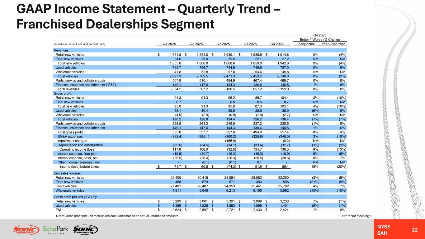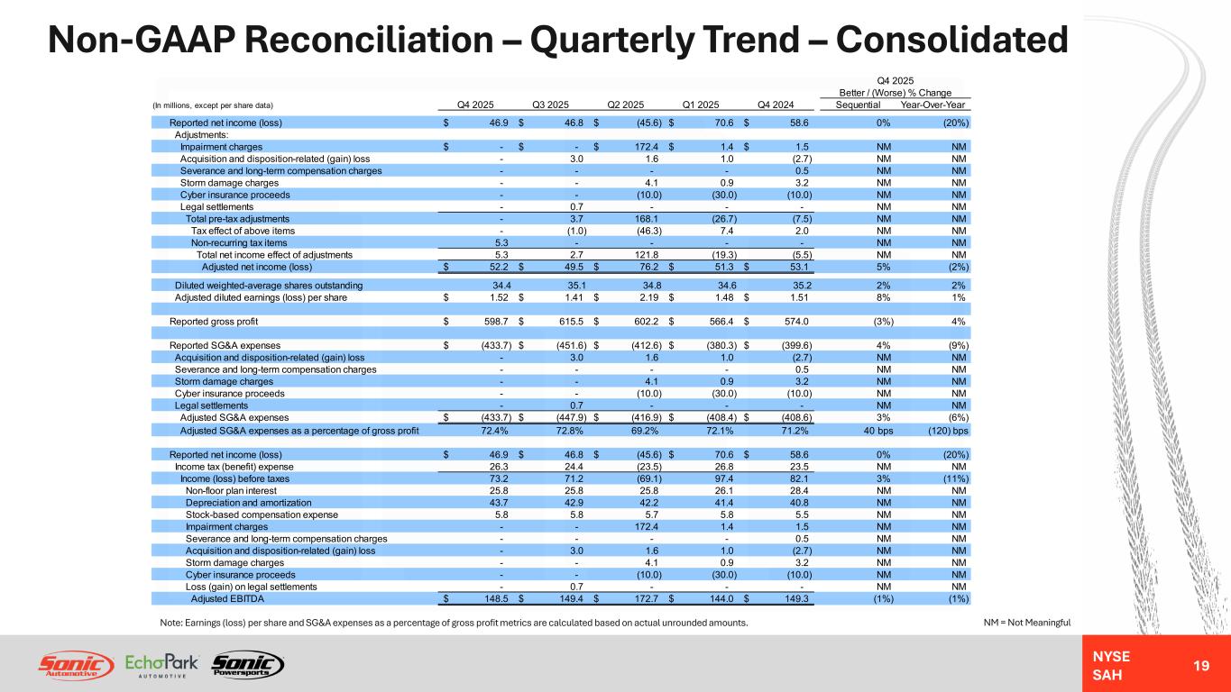 NYSE SAH GAAP Income Statement – Quarterly Trend – Consolidated 18 NM = Not MeaningfulNote: Earnings (loss) per share and gross profit per unit metrics are calculated based on actual unrounded amounts. Q4 2025 Better / (Worse) % Change (In millions, except unit, per unit, and per share data) Q4 2025 Q3 2025 Q2 2025 Q1 2025 Q4 2024 Sequential Year-Over-Year Revenues: Retail new vehicles 1,852.2$ 1,872.8$ 1,666.1$ 1,656.3$ 1,932.3$ (1%) (4%) Fleet new vehicles 24.1 26.0 29.4 22.1 27.3 NM NM Total new vehicles 1,876.3 1,898.8 1,695.5 1,678.4 1,959.6 (1%) (4%) Used vehicles 1,213.8 1,253.1 1,180.7 1,225.0 1,197.6 (3%) 1% Wholesale vehicles 63.6 84.2 83.3 82.7 71.3 NM NM Total vehicles 3,153.7 3,236.1 2,959.5 2,986.1 3,228.5 (3%) (2%) Parts, service and collision repair 515.3 533.9 495.6 474.4 476.7 (3%) 8% Finance, insurance and other, net ("F&I") 202.3 203.8 202.1 190.8 190.6 (1%) 6% Total revenues 3,871.3 3,973.8 3,657.2 3,651.3 3,895.8 (3%) (1%) Gross profit: Retail new vehicles 97.3 97.4 99.2 89.4 106.6 0% (9%) Fleet new vehicles 0.7 - 0.5 0.6 0.7 NM NM Total new vehicles 98.0 97.4 99.7 90.0 107.3 1% (9%) Used vehicles 41.4 45.2 48.1 46.4 37.8 (8%) 10% Wholesale vehicles (5.2) (3.3) (1.6) (1.4) (3.3) NM NM Total vehicles 134.2 139.3 146.2 135.0 141.8 (4%) (5%) Parts, service and collision repair 262.2 272.4 253.9 240.6 241.6 (4%) 9% Finance, insurance and other, net 202.3 203.8 202.1 190.8 190.6 (1%) 6% Total gross profit 598.7 615.5 602.2 566.4 574.0 (3%) 4% SG&A expenses (433.7) (451.6) (412.6) (380.3) (399.6) 4% (9%) Impairment charges - - (172.4) (1.4) (1.5) NM NM Depreciation and amortization (41.8) (41.2) (40.5) (39.7) (39.4) (2%) (6%) Operating income (loss) 123.2 122.7 (23.3) 145.0 133.5 0% (8%) Interest expense, floor plan (22.4) (23.9) (18.3) (20.0) (21.4) 6% (5%) Interest expense, other, net (27.6) (27.5) (27.4) (27.6) (29.9) 0% 8% Other income (expense), net - (0.1) (0.1) - (0.1) NM NM Income (loss) before taxes 73.2 71.2 (69.1) 97.4 82.1 3% (11%) Income tax benefit (expense) (26.3) (24.4) 23.5 (26.8) (23.5) (8%) (12%) Net income (loss) 46.9$ 46.8$ (45.6)$ 70.6$ 58.6$ 0% (20%) Diluted weighted-average shares outstanding 34.4 35.1 34.1 34.6 35.2 2% 2% Diluted earnings (loss) per share 1.36$ 1.33$ (1.34)$ 2.04$ 1.67$ 2% (19%) Unit sales volume: Retail new vehicles 30,485 32,086 29,478 29,075 33,190 (5%) (8%) Fleet new vehicles 458 579 571 383 506 (21%) (9%) Used vehicles 43,784 44,167 42,512 44,817 42,896 (1%) 2% Wholesale vehicles 7,252 8,957 9,368 9,405 8,460 (19%) (14%) Gross profit per unit ("GPU"): Retail new vehicles 3,193$ 3,035$ 3,365$ 3,075$ 3,212$ 5% (1%) Used vehicles 946$ 1,024$ 1,131$ 1,034$ 881$ (8%) 7% F&I 2,724$ 2,673$ 2,807$ 2,582$ 2,505$ 2% 9%
