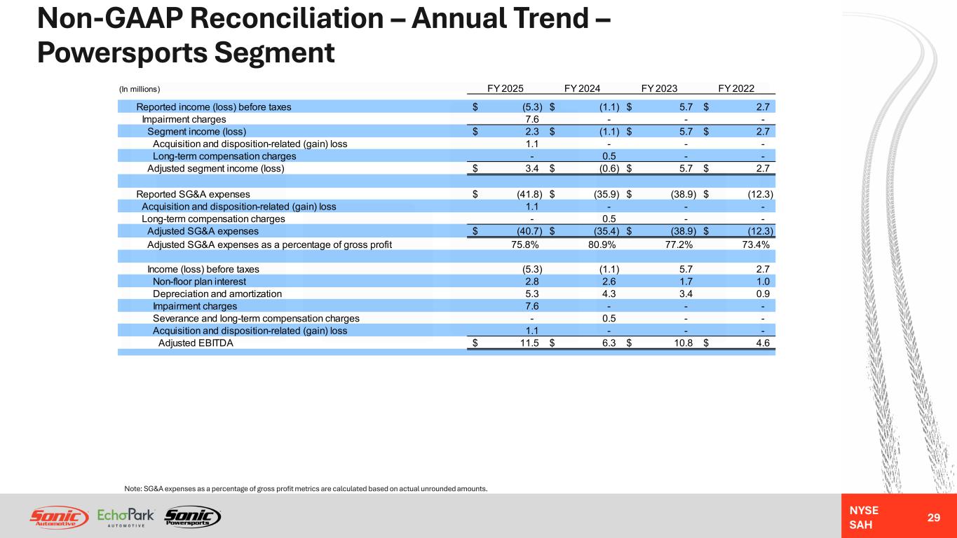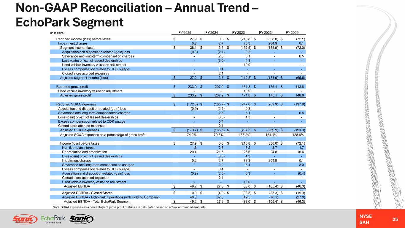 NYSE SAH GAAP Income Statement – Annual Trend – EchoPark Segment 24 NM = Not MeaningfulNote: Gross profit per unit metrics are calculated based on actual unrounded amounts. FY 2025 Better / (Worse) % Change (In millions, except unit, per unit, and per share data) FY 2025 FY 2024 FY 2023 FY 2022 FY 2021 Year-Over-Year Revenues: Total new vehicles -$ -$ 1.0$ 9.2$ 9.0$ 0% Used vehicles 1,747.8 1,838.0 2,143.8 2,116.8 2,032.6 (5%) Wholesale vehicles 104.6 95.8 168.1 209.9 82.4 NM Total vehicles 1,852.4 1,933.8 2,312.9 2,335.9 2,124.0 (4%) Finance, insurance and other, net ("F&I") 219.2 194.0 177.9 166.4 193.7 13% Total revenues 2,071.6 2,127.8 2,434.4 2,463.0 2,345.3 (3%) Gross profit: Total new vehicles - - 0.1 1.1 1.1 0% Used vehicles 16.5 15.2 (17.1) 4.4 (55.2) 8% Wholesale vehicles (1.8) (1.3) 1.9 2.4 7.3 NM Total vehicles 14.7 13.9 (15.1) 7.9 (46.8) 6% Finance, insurance and other, net 219.2 194.0 177.9 166.4 193.7 13% Total gross profit 233.9 207.9 161.8 175.1 148.8 13% SG&A expenses (172.8) (165.7) (247.0) (269.9) (197.8) (4%) Impairment charges (0.2) (2.7) (78.3) (204.9) (0.1) NM Depreciation and amortization (20.4) (21.8) (26.6) (24.6) (16.3) 6% Operating income (loss) 40.5 17.7 (190.1) (324.3) (65.4) 128% Interest expense, floor plan (11.1) (14.2) (17.4) (10.6) (5.0) 22% Interest expense, other, net (1.5) (2.7) (3.2) (3.9) (1.7) 46% Other income (expense), net - - (0.1) - - NM Income (loss) before taxes 27.9$ 0.8$ (210.8)$ (338.8)$ (72.1)$ 3383% Unit sales volume: Retail new vehicles - - 11 152 128 0% Used vehicles 67,636 69,053 73,676 64,107 77,835 (2%) Wholesale vehicles 11,836 11,059 11,512 11,236 11,667 7% Gross profit per unit ("GPU"): Retail new vehicles N/A N/A 6,934$ 7,510$ 8,303$ NM Total used vehicle and F&I 3,484$ 3,029$ 2,183$ 2,657$ 1,762$ 15%