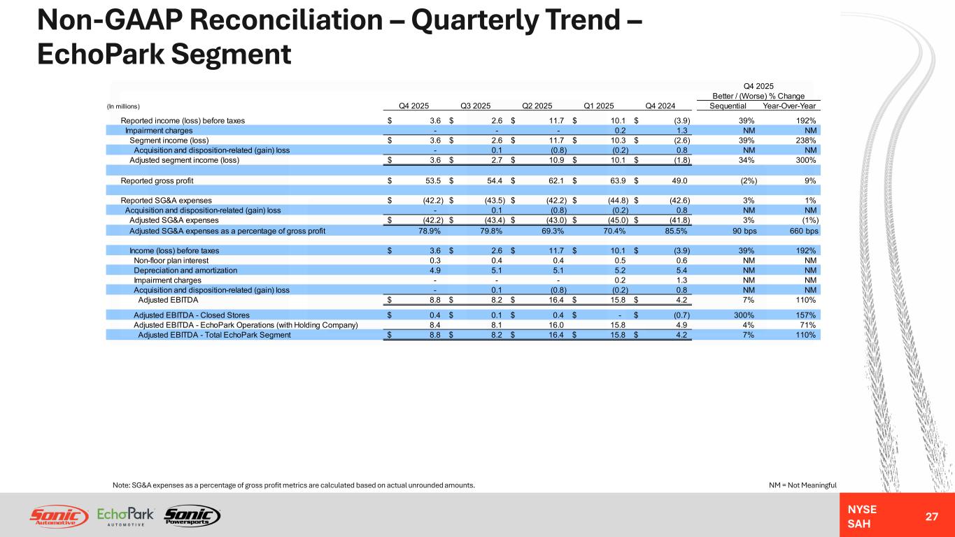 NYSE SAH GAAP Income Statement – Quarterly Trend – EchoPark Segment 26 NM = Not MeaningfulNote: Gross profit per unit metrics are calculated based on actual unrounded amounts. Q4 2025 Better / (Worse) % Change (In millions, except unit and per unit data) Q4 2025 Q3 2025 Q2 2025 Q1 2025 Q4 2024 Sequential Year-Over-Year Revenues: Used vehicles 407.5$ 439.2$ 427.4$ 473.7$ 436.0$ (7%) (7%) Wholesale vehicles 21.5 30.4 25.4 27.3 21.4 NM NM Total vehicles 429.0 469.6 452.8 501.0 457.4 (9%) (6%) Finance, insurance and other, net ("F&I") 51.7 52.9 55.8 58.7 48.8 (2%) 6% Total revenues 480.7 522.5 508.6 559.7 506.2 (8%) (5%) Gross profit: Used vehicles 2.1 2.0 6.9 5.4 0.8 5% 163% Wholesale vehicles (0.3) (0.5) (0.6) (0.2) (0.6) NM NM Total vehicles 1.8 1.5 6.3 5.2 0.2 20% 800% Finance, insurance and other, net 51.7 52.9 55.8 58.7 48.8 (2%) 6% Total gross profit 53.5 54.4 62.1 63.9 49.0 (2%) 9% SG&A expenses (42.2) (43.5) (42.2) (44.8) (42.6) 3% 1% Impairment charges - - - (0.2) (1.3) NM NM Depreciation and amortization (4.9) (5.1) (5.2) (5.2) (5.4) 5% 9% Operating income (loss) 6.4 5.8 14.7 13.7 (0.3) 11% 2233% Interest expense, floor plan (2.5) (2.8) (2.6) (3.1) (3.0) 11% 17% Interest expense, other, net (0.3) (0.4) (0.4) (0.4) (0.7) 19% 57% Other income (expense), net - - - (0.1) 0.1 NM NM Income (loss) before taxes 3.6$ 2.6$ 11.7$ 10.1$ (3.9)$ 39% 192% Unit sales volume: Used vehicles 15,743 16,353 16,742 18,798 16,674 (4%) (6%) Wholesale vehicles 2,365 3,224 3,097 3,150 2,752 (27%) (14%) Gross profit per unit ("GPU"): Total used vehicle and F&I 3,420$ 3,359$ 3,747$ 3,411$ 2,974$ 2% 15%