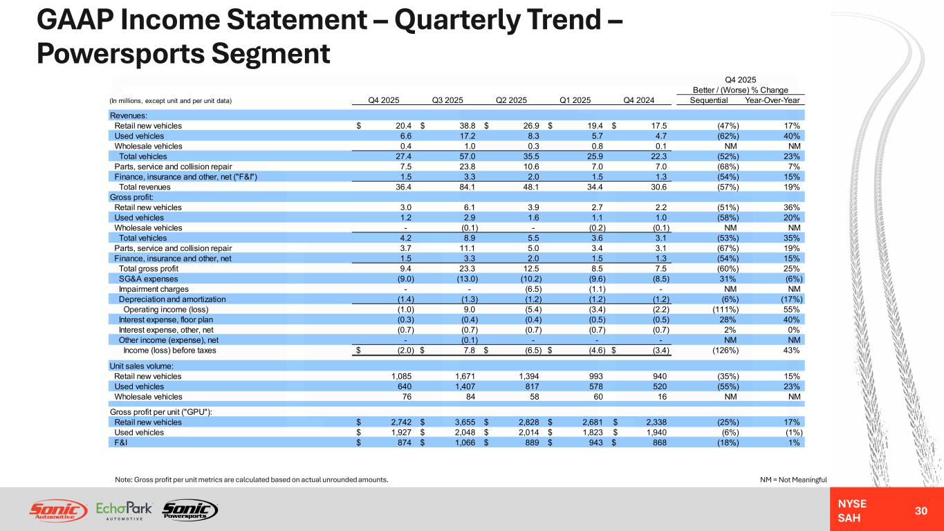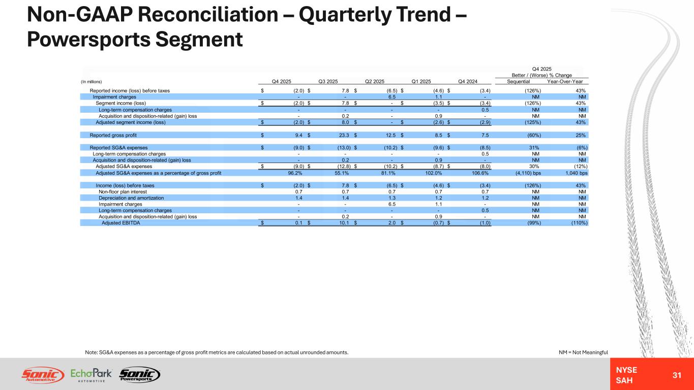 NYSE SAH GAAP Income Statement – Quarterly Trend – Powersports Segment 30 NM = Not MeaningfulNote: Gross profit per unit metrics are calculated based on actual unrounded amounts. Q4 2025 Better / (Worse) % Change (In millions, except unit and per unit data) Q4 2025 Q3 2025 Q2 2025 Q1 2025 Q4 2024 Sequential Year-Over-Year Revenues: Retail new vehicles 20.4$ 38.8$ 26.9$ 19.4$ 17.5$ (47%) 17% Used vehicles 6.6 17.2 8.3 5.7 4.7 (62%) 40% Wholesale vehicles 0.4 1.0 0.3 0.8 0.1 NM NM Total vehicles 27.4 57.0 35.5 25.9 22.3 (52%) 23% Parts, service and collision repair 7.5 23.8 10.6 7.0 7.0 (68%) 7% Finance, insurance and other, net ("F&I") 1.5 3.3 2.0 1.5 1.3 (54%) 15% Total revenues 36.4 84.1 48.1 34.4 30.6 (57%) 19% Gross profit: Retail new vehicles 3.0 6.1 3.9 2.7 2.2 (51%) 36% Used vehicles 1.2 2.9 1.6 1.1 1.0 (58%) 20% Wholesale vehicles - (0.1) - (0.2) (0.1) NM NM Total vehicles 4.2 8.9 5.5 3.6 3.1 (53%) 35% Parts, service and collision repair 3.7 11.1 5.0 3.4 3.1 (67%) 19% Finance, insurance and other, net 1.5 3.3 2.0 1.5 1.3 (54%) 15% Total gross profit 9.4 23.3 12.5 8.5 7.5 (60%) 25% SG&A expenses (9.0) (13.0) (10.2) (9.6) (8.5) 31% (6%) Impairment charges - - (6.5) (1.1) - NM NM Depreciation and amortization (1.4) (1.3) (1.2) (1.2) (1.2) (6%) (17%) Operating income (loss) (1.0) 9.0 (5.4) (3.4) (2.2) (111%) 55% Interest expense, floor plan (0.3) (0.4) (0.4) (0.5) (0.5) 28% 40% Interest expense, other, net (0.7) (0.7) (0.7) (0.7) (0.7) 2% 0% Other income (expense), net - (0.1) - - - NM NM Income (loss) before taxes (2.0)$ 7.8$ (6.5)$ (4.6)$ (3.4)$ (126%) 43% Unit sales volume: Retail new vehicles 1,085 1,671 1,394 993 940 (35%) 15% Used vehicles 640 1,407 817 578 520 (55%) 23% Wholesale vehicles 76 84 58 60 16 NM NM Gross profit per unit ("GPU"): Retail new vehicles 2,742$ 3,655$ 2,828$ 2,681$ 2,338$ (25%) 17% Used vehicles 1,927$ 2,048$ 2,014$ 1,823$ 1,940$ (6%) (1%) F&I 874$ 1,066$ 889$ 943$ 868$ (18%) 1%