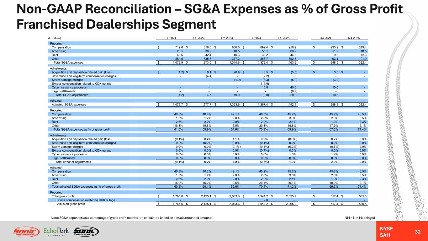 NYSE SAH Non-GAAP Reconciliation – Quarterly Trend – Powersports Segment 31 NM = Not MeaningfulNote: SG&A expenses as a percentage of gross profit metrics are calculated based on actual unrounded amounts. Q4 2025 Better / (Worse) % Change (In millions) Q4 2025 Q3 2025 Q2 2025 Q1 2025 Q4 2024 Sequential Year-Over-Year Reported income (loss) before taxes (2.0)$ 7.8$ (6.5)$ (4.6)$ (3.4)$ (126%) 43% Impairment charges - - 6.5 1.1 - NM NM Segment income (loss) (2.0)$ 7.8$ -$ (3.5)$ (3.4)$ (126%) 43% Long-term compensation charges - - - - 0.5 NM NM Acquisition and disposition-related (gain) loss - 0.2 - 0.9 - NM NM Adjusted segment income (loss) (2.0)$ 8.0$ -$ (2.6)$ (2.9)$ (125%) 43% Reported gross profit 9.4$ 23.3$ 12.5$ 8.5$ 7.5$ (60%) 25% Reported SG&A expenses (9.0)$ (13.0)$ (10.2)$ (9.6)$ (8.5)$ 31% (6%) Long-term compensation charges - - - - 0.5 NM NM Acquisition and disposition-related (gain) loss - 0.2 - 0.9 - NM NM Adjusted SG&A expenses (9.0)$ (12.8)$ (10.2)$ (8.7)$ (8.0)$ 30% (12%) Adjusted SG&A expenses as a percentage of gross profit 96.2% 55.1% 81.1% 102.0% 106.6% (4,110) bps 1,040 bps Income (loss) before taxes (2.0)$ 7.8$ (6.5)$ (4.6)$ (3.4)$ (126%) 43% Non-floor plan interest 0.7 0.7 0.7 0.7 0.7 NM NM Depreciation and amortization 1.4 1.4 1.3 1.2 1.2 NM NM Impairment charges - - 6.5 1.1 - NM NM Long-term compensation charges - - - - 0.5 NM NM Acquisition and disposition-related (gain) loss - 0.2 - 0.9 - NM NM Adjusted EBITDA 0.1$ 10.1$ 2.0$ (0.7)$ (1.0)$ (99%) (110%)