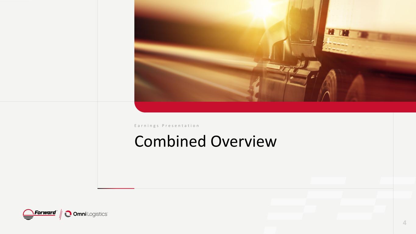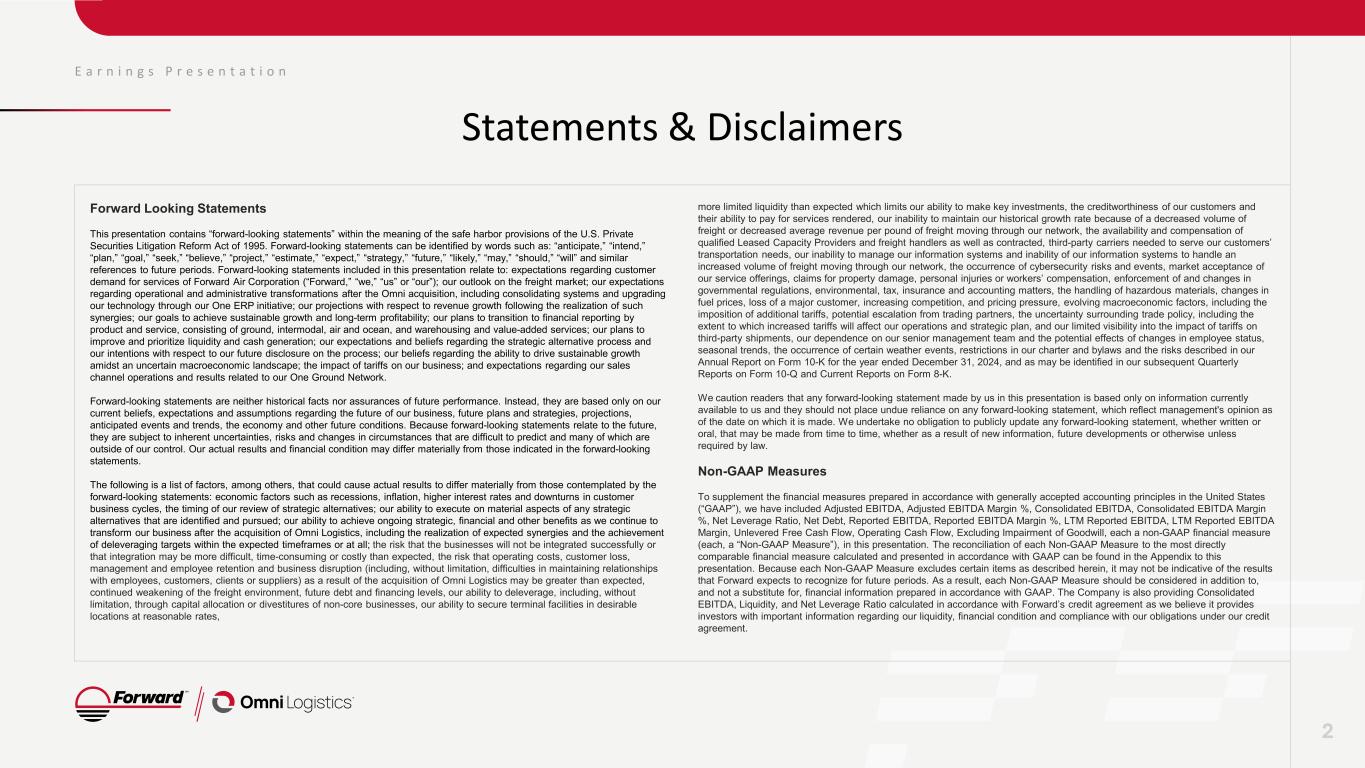 E a r n i n g s P r e s e n t a t i o n Statements & Disclaimers Forward Looking Statements This presentation contains “forward-looking statements” within the meaning of the safe harbor provisions of the U.S. Private Securities Litigation Reform Act of 1995. Forward-looking statements can be identified by words such as: “anticipate,” “intend,” “plan,” “goal,” “seek,” “believe,” “project,” “estimate,” “expect,” “strategy,” “future,” “likely,” “may,” “should,” “will” and similar references to future periods. Forward-looking statements included in this presentation relate to: expectations regarding customer demand for services of Forward Air Corporation (“Forward,” “we,” “us” or “our”); our outlook on the freight market; our expectations regarding operational and administrative transformations after the Omni acquisition, including consolidating systems and upgrading our technology through our One ERP initiative; our projections with respect to revenue growth following the realization of such synergies; our goals to achieve sustainable growth and long-term profitability; our plans to transition to financial reporting by product and service, consisting of ground, intermodal, air and ocean, and warehousing and value-added services; our plans to improve and prioritize liquidity and cash generation; our expectations and beliefs regarding the strategic alternative process and our intentions with respect to our future disclosure on the process; our beliefs regarding the ability to drive sustainable growth amidst an uncertain macroeconomic landscape; the impact of tariffs on our business; and expectations regarding our sales channel operations and results related to our One Ground Network. Forward-looking statements are neither historical facts nor assurances of future performance. Instead, they are based only on our current beliefs, expectations and assumptions regarding the future of our business, future plans and strategies, projections, anticipated events and trends, the economy and other future conditions. Because forward-looking statements relate to the future, they are subject to inherent uncertainties, risks and changes in circumstances that are difficult to predict and many of which are outside of our control. Our actual results and financial condition may differ materially from those indicated in the forward-looking statements. The following is a list of factors, among others, that could cause actual results to differ materially from those contemplated by the forward-looking statements: economic factors such as recessions, inflation, higher interest rates and downturns in customer business cycles, the timing of our review of strategic alternatives; our ability to execute on material aspects of any strategic alternatives that are identified and pursued; our ability to achieve ongoing strategic, financial and other benefits as we continue to transform our business after the acquisition of Omni Logistics, including the realization of expected synergies and the achievement of deleveraging targets within the expected timeframes or at all; the risk that the businesses will not be integrated successfully or that integration may be more difficult, time-consuming or costly than expected, the risk that operating costs, customer loss, management and employee retention and business disruption (including, without limitation, difficulties in maintaining relationships with employees, customers, clients or suppliers) as a result of the acquisition of Omni Logistics may be greater than expected, continued weakening of the freight environment, future debt and financing levels, our ability to deleverage, including, without limitation, through capital allocation or divestitures of non-core businesses, our ability to secure terminal facilities in desirable locations at reasonable rates, more limited liquidity than expected which limits our ability to make key investments, the creditworthiness of our customers and their ability to pay for services rendered, our inability to maintain our historical growth rate because of a decreased volume of freight or decreased average revenue per pound of freight moving through our network, the availability and compensation of qualified Leased Capacity Providers and freight handlers as well as contracted, third-party carriers needed to serve our customers’ transportation needs, our inability to manage our information systems and inability of our information systems to handle an increased volume of freight moving through our network, the occurrence of cybersecurity risks and events, market acceptance of our service offerings, claims for property damage, personal injuries or workers’ compensation, enforcement of and changes in governmental regulations, environmental, tax, insurance and accounting matters, the handling of hazardous materials, changes in fuel prices, loss of a major customer, increasing competition, and pricing pressure, evolving macroeconomic factors, including the imposition of additional tariffs, potential escalation from trading partners, the uncertainty surrounding trade policy, including the extent to which increased tariffs will affect our operations and strategic plan, and our limited visibility into the impact of tariffs on third-party shipments, our dependence on our senior management team and the potential effects of changes in employee status, seasonal trends, the occurrence of certain weather events, restrictions in our charter and bylaws and the risks described in our Annual Report on Form 10-K for the year ended December 31, 2024, and as may be identified in our subsequent Quarterly Reports on Form 10-Q and Current Reports on Form 8-K. We caution readers that any forward-looking statement made by us in this presentation is based only on information currently available to us and they should not place undue reliance on any forward-looking statement, which reflect man