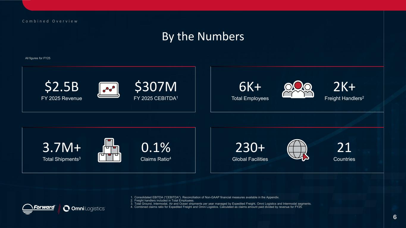 C o m b i n e d O v e r v i e w Who We Are: A Story of Transformation and Excellence Our Heritage Forward Air's revolutionary expedited ground freight network, established in 1981, and Omni’s innovative logistics solutions, founded in 2000, represent decades of excellence in logistics innovation. Our Combined Strength Together, we have created a logistics powerhouse that combines Forward Air's robust North American LTL network with Omni's global logistics solutions, delivering unprecedented value and capabilities to our customers. Our Future This strategic union positions us as a leading force in global logistics, offering comprehensive solutions that span continents and streamline supply chains. 5