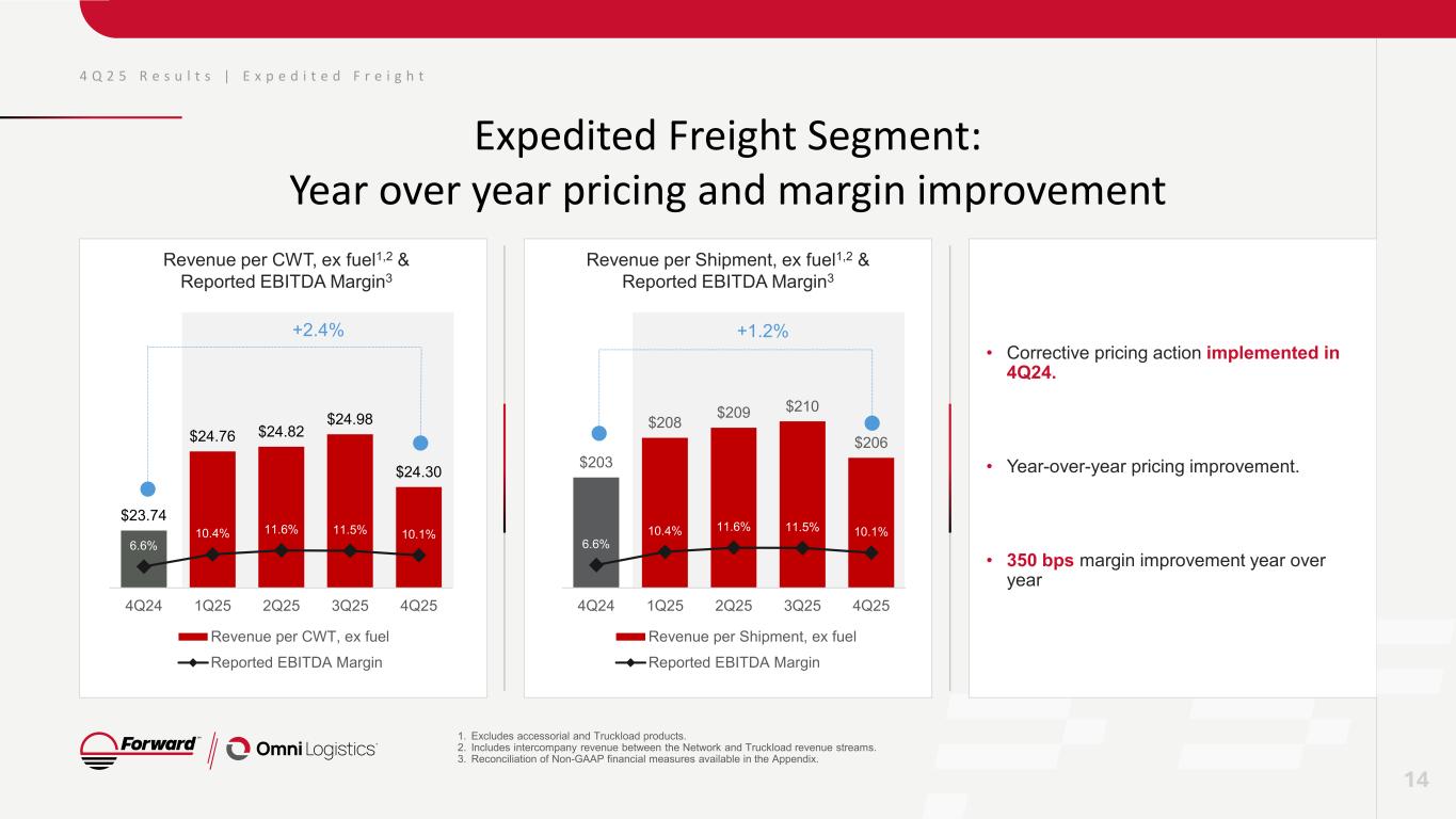 4 Q 2 5 R e s u l t s | E x p e d i t e d F r e i g h t Expedited Freight Segment Results by Quarter 1. Segment totals do not include intercompany eliminations or corporate unallocated expenses. 2. Reconciliation of Non-GAAP financial measures available in the Appendix. Excludes impairment of goodwill. Segment Revenue1 Reported EBITDA2 & Reported EBITDA Margin2 13 In millions, except for margin $266 $249 $258 $259 $247 4Q24 1Q25 2Q25 3Q25 4Q25 $18 $26 $30 $30 $25 6.6% 10.4% 11.6% 11.5% 10.1% 4Q24 1Q25 2Q25 3Q25 4Q25