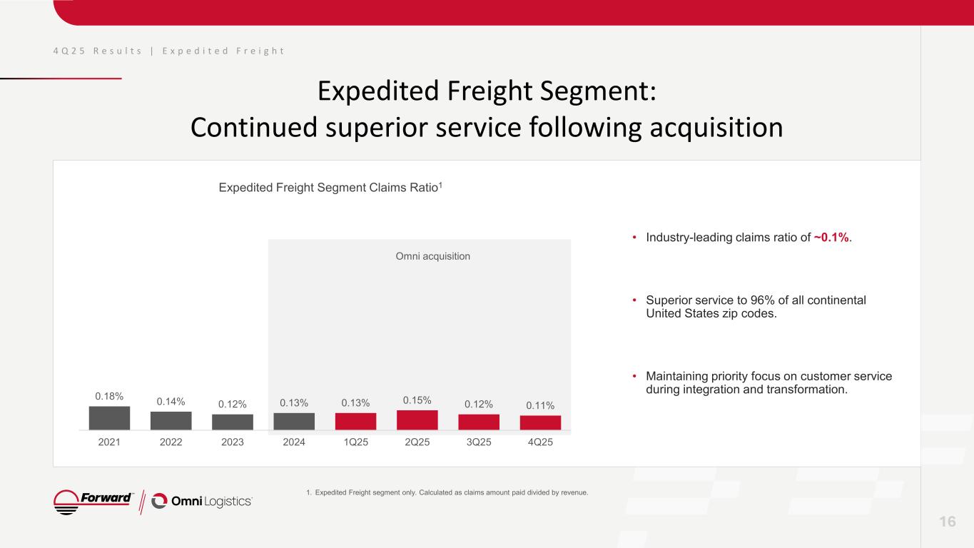 4 Q 2 5 R e s u l t s | E x p e d i t e d F r e i g h t Expedited Freight Segment Financial Results 4Q 2025 4Q 2024 Change Revenue $247 $266 (7.1%) Operating Income $15 $7 110.1% Operating Ratio 93.8% 97.3% 3.4% Reported EBITDA $25 $18 42% Reported EBITDA Margin 10.1% 6.6% 3.5% 11.1 LTL Shipments per Workday1 LTL Tonnage per Workday1 LTL Revenue per Shipment ex-fuel 9,355 $206 In millions, except for margin 15 1. In thousands