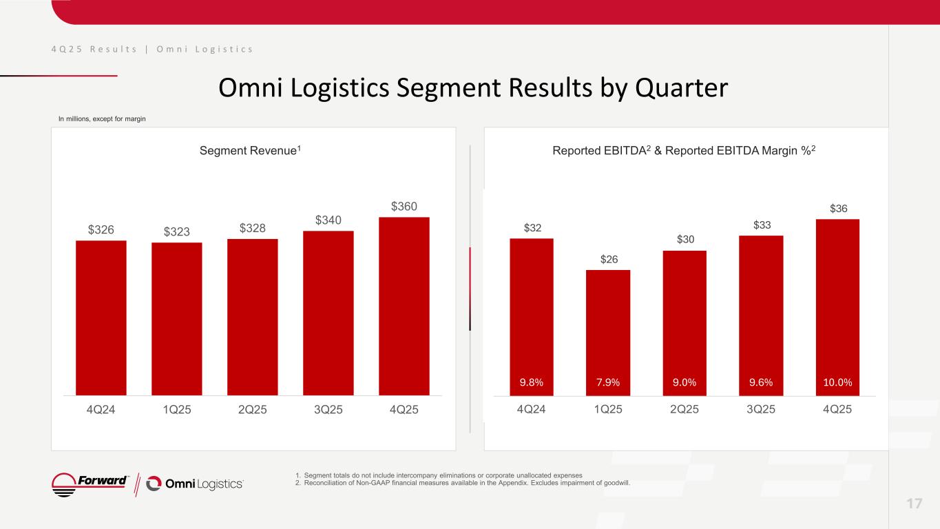 0.18% 0.14% 0.12% 0.13% 0.13% 0.15% 0.12% 0.11% 2021 2022 2023 2024 1Q25 2Q25 3Q25 4Q25 4 Q 2 5 R e s u l t s | E x p e d i t e d F r e i g h t Expedited Freight Segment: Continued superior service following acquisition 16 Omni acquisition Expedited Freight Segment Claims Ratio1 • Industry-leading claims ratio of ~0.1%. • Superior service to 96% of all continental United States zip codes. • Maintaining priority focus on customer service during integration and transformation. 1. Expedited Freight segment only. Calculated as claims amount paid divided by revenue.