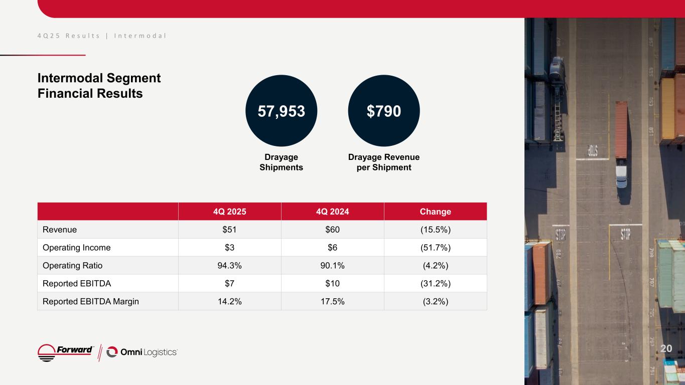 Omni Segment Financial Results 4Q 2025 4Q 2024 Change Revenue $360 $326 10.5% Operating Income $10 $91 4.2% Operating Ratio 97.3% 97.1%1 (0.2%) Reported EBITDA $36 $321 12.0% Reported EBITDA Margin 10.0% 9.8%1 0.1% 4 Q 2 5 R e s u l t s | O m n i L o g i s t i c s In millions, except for margin 18 1. Operating Income, Operating Ratio, Reported EBITDA and Reported EBITDA Margin shown excluding impairment of goodwill.