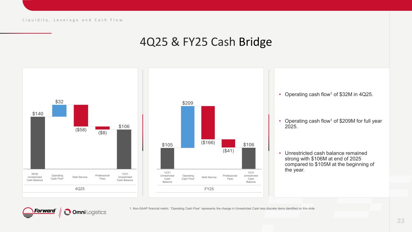 $42 $46 $52 $79 $32 4Q24 1Q25 2Q25 3Q25 4Q25 L i q u i d i t y , L e v e r a g e a n d C a s h F l o w Resilient cash generation despite freight recession 1. Non-GAAP financial metrics. “Operating Cash Flow” and “Unlevered Free Cash Flow” represent the change in Unrestricted Cash less discrete items identified on this slide. 2. Totals may not foot due to rounding. 22 • Asset-light business model with meaningful upside as cost savings measures are recognized Operating Cash Flow1 In millions 4Q24 1Q25 2Q25 3Q25 4Q25 Change in Unrestricted Cash ($32) $11 ($21) $45 ($34) (+) Debt Service 64 25 59 24 58 (+) Term Loan Paydown 0 0 0 0 0 (-) LC Release (2) 0 0 0 0 Unlevered Free Cash Flow1 $31 $37 $38 $70 $24 (+) Transaction/Integration Fees 12 9 14 10 8 (+) Earnouts & Purchase Price Adjustments 0 0 0 0 0 Operating Cash Flow1 $42 $46 $52 $79 $32