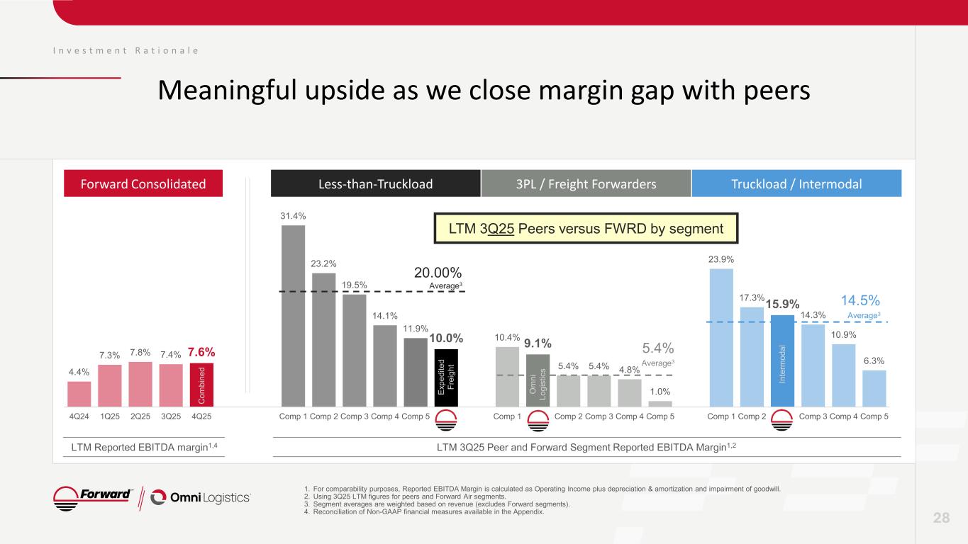 I n v e s t m e n t R a t i o n a l e Laying the foundation for future profitable growth Strong brand, customer value proposition and loyalty Robust North American LTL network with international logistics capabilities Superior service with consistently low claims ratio of 0.1%1 Differentiated and diversified solutions with global scale Highly customizable and specialized service offering of vertically-integrated solutions Scalable growth with over 230 global facilities in 21 countries Rationalized cost structure poised for profitable growth Asset-light business model with normalizing free cash flow generation Improved consolidated Reported EBITDA margin, excluding goodwill, by 320 basis points in 2025 compared to 20242 27 1. Combined claims ratio for Expedited Freight and Omni as of FY24. Calculated as claims amount paid divided by revenue for FY24. 2. Reconciliation of Non-GAAP financial measures available in the Appendix. Excludes impairment of goodwill.
