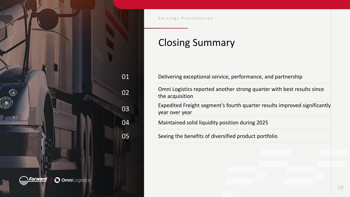 4.4% 7.3% 7.8% 7.4% 7.6% 31.4% 23.2% 19.5% 14.1% 11.9% 10.0% 10.4% 9.1% 5.4% 5.4% 4.8% 1.0% 23.9% 17.3%15.9% 14.3% 10.9% 6.3% 4Q24 1Q25 2Q25 3Q25 4Q25 Comp 1 Comp 2 Comp 3 Comp 4 Comp 5 Comp 1 Comp 2 Comp 3 Comp 4 Comp 5 Comp 1 Comp 2 Comp 3 Comp 4 Comp 5 I n v e s t m e n t R a t i o n a l e Meaningful upside as we close margin gap with peers 1. For comparability purposes, Reported EBITDA Margin is calculated as Operating Income plus depreciation & amortization and impairment of goodwill. 2. Using 3Q25 LTM figures for peers and Forward Air segments. 3. Segment averages are weighted based on revenue (excludes Forward segments). 4. Reconciliation of Non-GAAP financial measures available in the Appendix. 20.00% Average3 5.4% Average3 14.5% Average3 28 Forward Consolidated Less-than-Truckload 3PL / Freight Forwarders Truckload / Intermodal LTM Reported EBITDA margin1,4 LTM 3Q25 Peer and Forward Segment Reported EBITDA Margin1,2 Ex pe di te d Fr ei gh t O m ni Lo gi st ic s In te rm od al C om bi ne d LTM 3Q25 Peers versus FWRD by segment