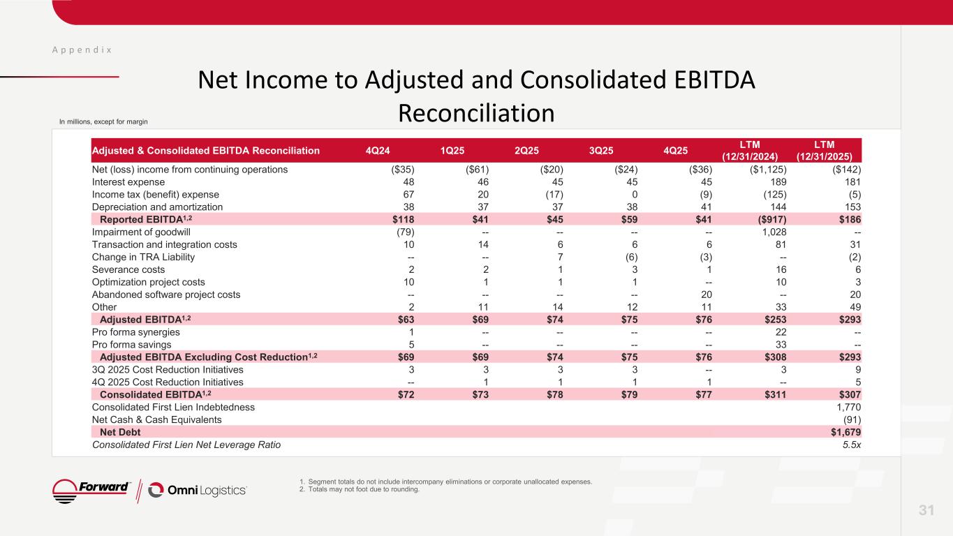 A p p e n d i x 31 1. Segment totals do not include intercompany eliminations or corporate unallocated expenses. 2. Totals may not foot due to rounding. In millions, except for margin Net Income to Adjusted and Consolidated EBITDA Reconciliation Adjusted & Consolidated EBITDA Reconciliation 4Q24 1Q25 2Q25 3Q25 4Q25 LTM (12/31/2024) LTM (12/31/2025) Net (loss) income from continuing operations ($35) ($61) ($20) ($24) ($36) ($1,125) ($142) Interest expense 48 46 45 45 45 189 181 Income tax (benefit) expense 67 20 (17) 0 (9) (125) (5) Depreciation and amortization 38 37 37 38 41 144 153 Reported EBITDA1,2 $118 $41 $45 $59 $41 ($917) $186 Impairment of goodwill (79) -- -- -- -- 1,028 -- Transaction and integration costs 10 14 6 6 6 81 31 Change in TRA Liability -- -- 7 (6) (3) -- (2) Severance costs 2 2 1 3 1 16 6 Optimization project costs 10 1 1 1 -- 10 3 Abandoned software project costs -- -- -- -- 20 -- 20 Other 2 11 14 12 11 33 49 Adjusted EBITDA1,2 $63 $69 $74 $75 $76 $253 $293 Pro forma synergies 1 -- -- -- -- 22 -- Pro forma savings 5 -- -- -- -- 33 -- Adjusted EBITDA Excluding Cost Reduction1,2 $69 $69 $74 $75 $76 $308 $293 3Q 2025 Cost Reduction Initiatives 3 3 3 3 -- 3 9 4Q 2025 Cost Reduction Initiatives -- 1 1 1 1 -- 5 Consolidated EBITDA1,2 $72 $73 $78 $79 $77 $311 $307 Consolidated First Lien Indebtedness 1,770 Net Cash & Cash Equivalents (91) Net Debt $1,679 Consolidated First Lien Net Leverage Ratio 5.5x