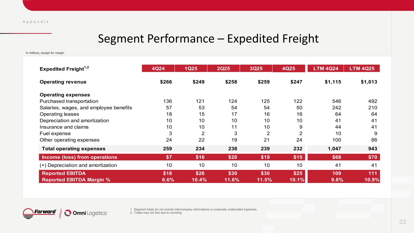 A p p e n d i x Segment Performance – Expedited Freight 32 1. Segment totals do not include intercompany eliminations or corporate unallocated expenses. 2. Totals may not foot due to rounding. In millions, except for margin Expedited Freight1,2 4Q24 1Q25 2Q25 3Q25 4Q25 LTM 4Q24 LTM 4Q25 Operating revenue $266 $249 $258 $259 $247 $1,115 $1,013 Operating expenses Purchased transportation 136 121 124 125 122 546 492 Salaries, wages, and employee benefits 57 53 54 54 50 242 210 Operating leases 18 15 17 16 16 64 64 Depreciation and amortization 10 10 10 10 10 41 41 Insurance and claims 10 10 11 10 9 44 41 Fuel expense 3 2 3 2 2 10 9 Other operating expenses 24 22 19 21 24 100 86 Total operating expenses 259 234 238 239 232 1,047 943 Income (loss) from operations $7 $16 $20 $19 $15 $68 $70 (+) Depreciation and amortization 10 10 10 10 10 41 41 Reported EBITDA $18 $26 $30 $30 $25 109 111 Reported EBITDA Margin % 6.6% 10.4% 11.6% 11.5% 10.1% 9.8% 10.9%