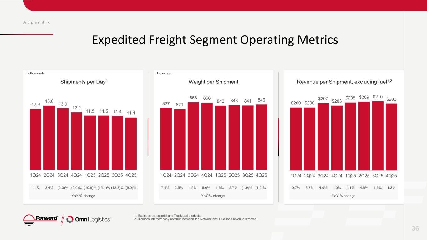 A p p e n d i x Consolidated LTM Financials by Quarter 35 1. Totals may not foot due to rounding. 2. Reported EBITDA and Reported EBITDA Margin shown excluding impairment of goodwill. In millions, except for margin Consolidated1 LTM 4Q24 LTM 1Q25 LTM 2Q25 LTM 3Q25 LTM 4Q25 Operating revenue $2,474 $2,546 $2,521 $2,497 $2,495 Operating expenses Purchased transportation 1,251 1,278 1,260 1,243 1,244 Salaries, wages, and employee benefits 536 549 551 569 536 Operating leases 182 192 195 199 204 Depreciation and amortization 144 150 138 150 153 Insurance and claims 65 67 68 63 59 Fuel expense 21 22 21 21 20 Other operating expenses 310 252 230 215 243 Impairment of goodwill 1,028 1,028 (64) (79) - Total operating expenses 3,537 3,538 2,398 2,382 2,459 Income (loss) from operations ($1,063) ($992) $123 $115 $36 (+) Impairment of goodwill 1,028 1,028 (64) (79) - Adjusted income (loss) from operations ($35) $36 $59 $36 $36 (+) Depreciation and amortization 144 150 138 150 153 Reported EBITDA2 $109 $186 $196 $186 $189 Reported EBITDA Margin %2 4.4% 7.3% 7.8% 7.4% 7.6%