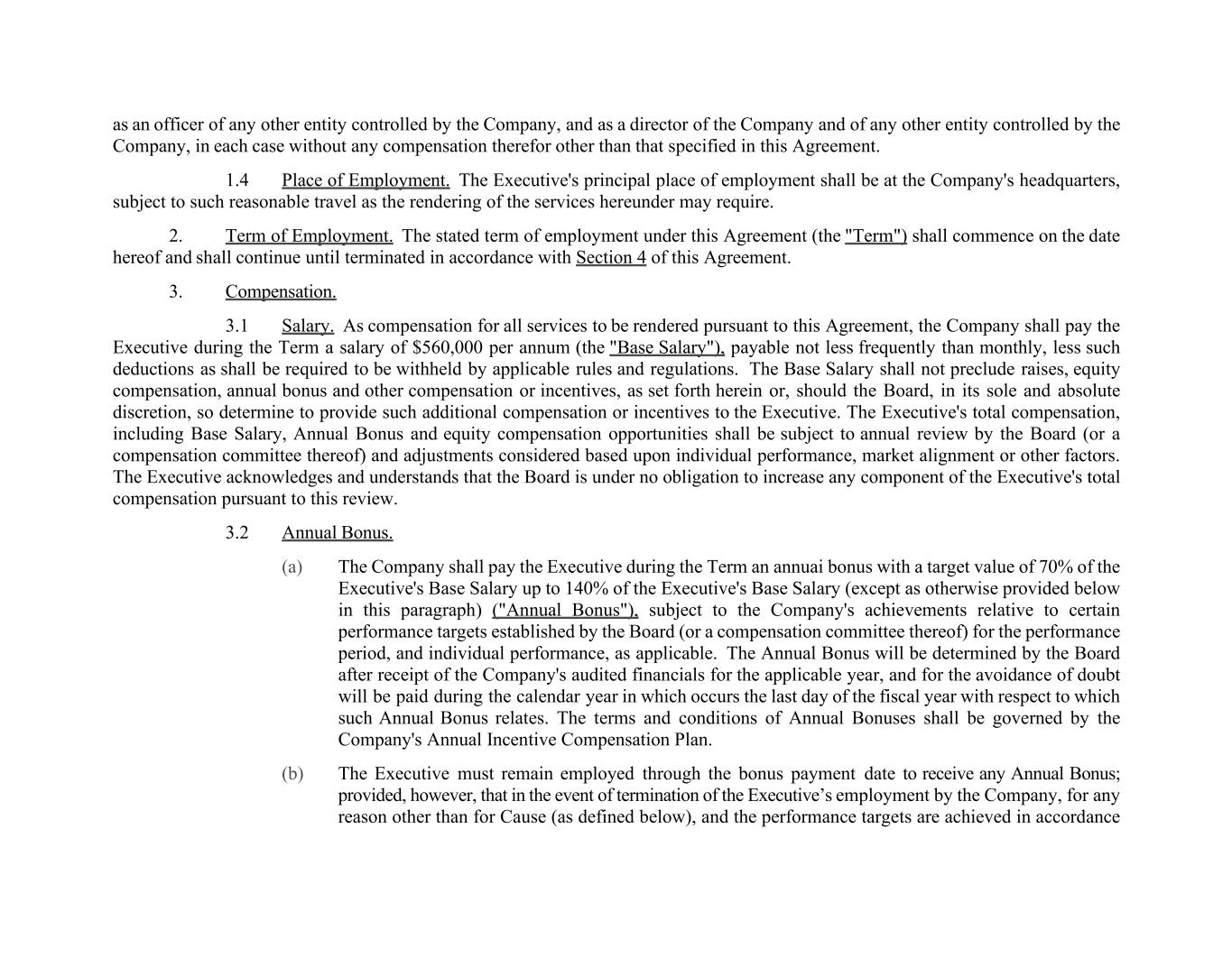 as an officer of any other entity controlled by the Company, and as a director of the Company and of any other entity controlled by the Company, in each case without any compensation therefor other than that specified in this Agreement. 1.4 Place of Employment. The Executive's principal place of employment shall be at the Company's headquarters, subject to such reasonable travel as the rendering of the services hereunder may require. 2. Term of Employment. The stated term of employment under this Agreement (the "Term") shall commence on the date hereof and shall continue until terminated in accordance with Section 4 of this Agreement. 3. Compensation. 3.1 Salary. As compensation for all services to be rendered pursuant to this Agreement, the Company shall pay the Executive during the Term a salary of $560,000 per annum (the "Base Salary"), payable not less frequently than monthly, less such deductions as shall be required to be withheld by applicable rules and regulations. The Base Salary shall not preclude raises, equity compensation, annual bonus and other compensation or incentives, as set forth herein or, should the Board, in its sole and absolute discretion, so determine to provide such additional compensation or incentives to the Executive. The Executive's total compensation, including Base Salary, Annual Bonus and equity compensation opportunities shall be subject to annual review by the Board (or a compensation committee thereof) and adjustments considered based upon individual performance, market alignment or other factors. The Executive acknowledges and understands that the Board is under no obligation to increase any component of the Executive's total compensation pursuant to this review. 3.2 Annual Bonus. (a) The Company shall pay the Executive during the Term an annuai bonus with a target value of 70% of the Executive's Base Salary up to 140% of the Executive's Base Salary (except as otherwise provided below in this paragraph) ("Annual Bonus"), subject to the Company's achievements relative to certain performance targets established by the Board (or a compensation committee thereof) for the performance period, and individual performance, as applicable. The Annual Bonus will be determined by the Board after receipt of the Company's audited financials for the applicable year, and for the avoidance of doubt will be paid during the calendar year in which occurs the last day of the fiscal year with respect to which such Annual Bonus relates. The terms and conditions of Annual Bonuses shall be governed by the Company's Annual Incentive Compensation Plan. (b) The Executive must remain employed through the bonus payment date to receive any Annual Bonus; provided, however, that in the event of termination of the Executive’s employment by the Company, for any reason other than for Cause (as defined below), and the performance targets are achieved in accordance
