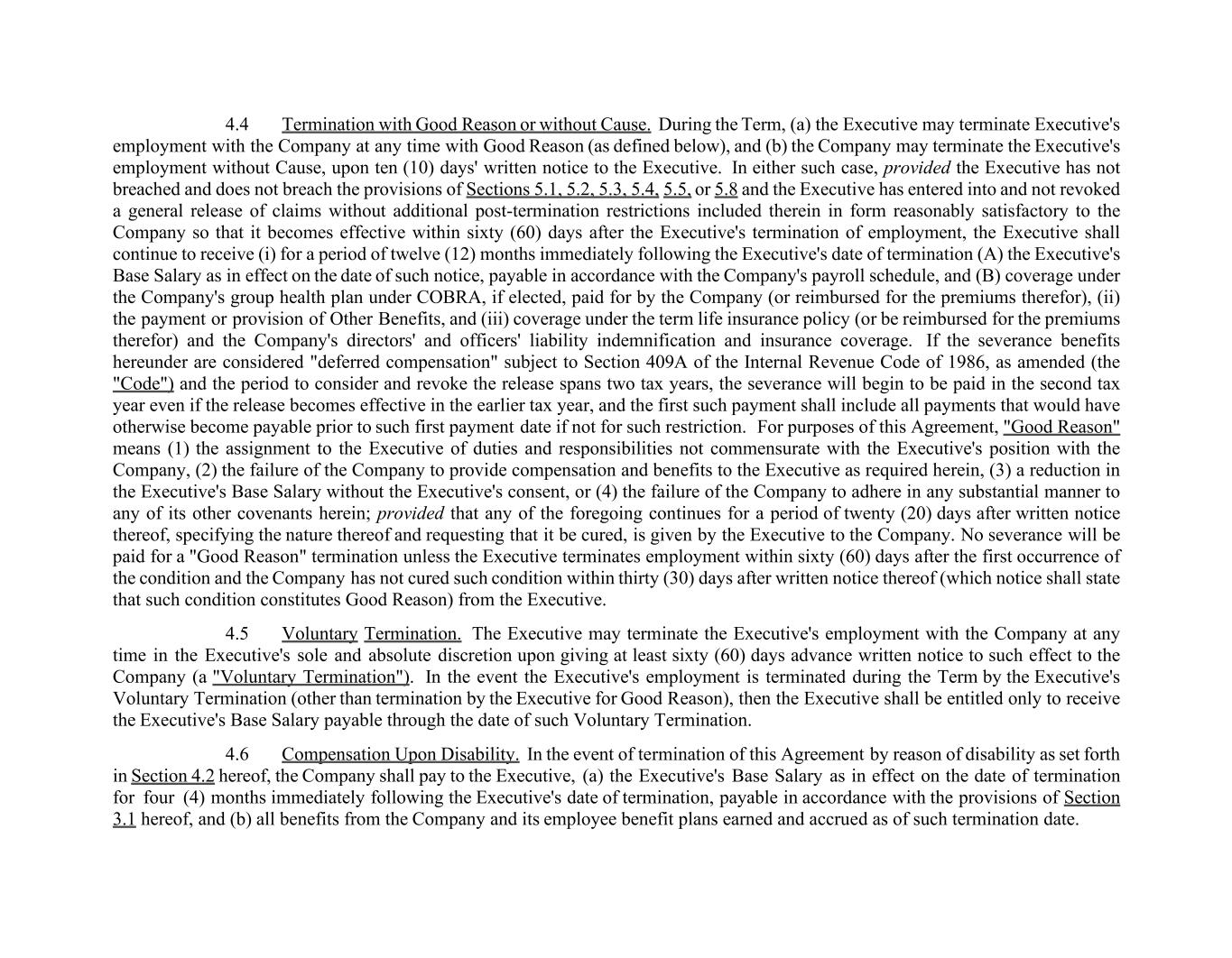 4.4 Termination with Good Reason or without Cause. During the Term, (a) the Executive may terminate Executive's employment with the Company at any time with Good Reason (as defined below), and (b) the Company may terminate the Executive's employment without Cause, upon ten (10) days' written notice to the Executive. In either such case, provided the Executive has not breached and does not breach the provisions of Sections 5.1, 5.2, 5.3, 5.4, 5.5, or 5.8 and the Executive has entered into and not revoked a general release of claims without additional post-termination restrictions included therein in form reasonably satisfactory to the Company so that it becomes effective within sixty (60) days after the Executive's termination of employment, the Executive shall continue to receive (i) for a period of twelve (12) months immediately following the Executive's date of termination (A) the Executive's Base Salary as in effect on the date of such notice, payable in accordance with the Company's payroll schedule, and (B) coverage under the Company's group health plan under COBRA, if elected, paid for by the Company (or reimbursed for the premiums therefor), (ii) the payment or provision of Other Benefits, and (iii) coverage under the term life insurance policy (or be reimbursed for the premiums therefor) and the Company's directors' and officers' liability indemnification and insurance coverage. If the severance benefits hereunder are considered "deferred compensation" subject to Section 409A of the Internal Revenue Code of 1986, as amended (the "Code") and the period to consider and revoke the release spans two tax years, the severance will begin to be paid in the second tax year even if the release becomes effective in the earlier tax year, and the first such payment shall include all payments that would have otherwise become payable prior to such first payment date if not for such restriction. For purposes of this Agreement, "Good Reason" means (1) the assignment to the Executive of duties and responsibilities not commensurate with the Executive's position with the Company, (2) the failure of the Company to provide compensation and benefits to the Executive as required herein, (3) a reduction in the Executive's Base Salary without the Executive's consent, or (4) the failure of the Company to adhere in any substantial manner to any of its other covenants herein; provided that any of the foregoing continues for a period of twenty (20) days after written notice thereof, specifying the nature thereof and requesting that it be cured, is given by the Executive to the Company. No severance will be paid for a "Good Reason" termination unless the Executive terminates employment within sixty (60) days after the first occurrence of the condition and the Company has not cured such condition within thirty (30) days after written notice thereof (which notice shall state that such condition constitutes Good Reason) from the Executive. 4.5 Voluntary Termination. The Executive may terminate the Executive's employment with the Company at any time in the Executive's sole and absolute discretion upon giving at least sixty (60) days advance written notice to such effect to the Company (a "Voluntary Termination"). In the event the Executive's employment is terminated during the Term by the Executive's Voluntary Termination (other than termination by the Executive for Good Reason), then the Executive shall be entitled only to receive the Executive's Base Salary payable through the date of such Voluntary Termination. 4.6 Compensation Upon Disability. In the event of termination of this Agreement by reason of disability as set forth in Section 4.2 hereof, the Company shall pay to the Executive, (a) the Executive's Base Salary as in effect on the date of termination for four (4) months immediately following the Executive's date of termination, payable in accordance with the provisions of Section 3.1 hereof, and (b) all benefits from the Company and its employee benefit plans earned and accrued as of such termination date.