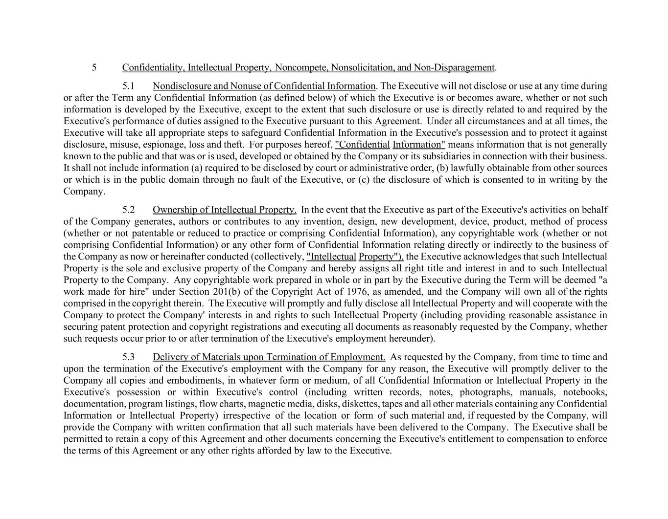 5 Confidentiality, Intellectual Property, Noncompete, Nonsolicitation, and Non-Disparagement. 5.1 Nondisclosure and Nonuse of Confidential Information. The Executive will not disclose or use at any time during or after the Term any Confidential Information (as defined below) of which the Executive is or becomes aware, whether or not such information is developed by the Executive, except to the extent that such disclosure or use is directly related to and required by the Executive's performance of duties assigned to the Executive pursuant to this Agreement. Under all circumstances and at all times, the Executive will take all appropriate steps to safeguard Confidential Information in the Executive's possession and to protect it against disclosure, misuse, espionage, loss and theft. For purposes hereof, "Confidential Information" means information that is not generally known to the public and that was or is used, developed or obtained by the Company or its subsidiaries in connection with their business. It shall not include information (a) required to be disclosed by court or administrative order, (b) lawfully obtainable from other sources or which is in the public domain through no fault of the Executive, or (c) the disclosure of which is consented to in writing by the Company. 5.2 Ownership of Intellectual Property. In the event that the Executive as part of the Executive's activities on behalf of the Company generates, authors or contributes to any invention, design, new development, device, product, method of process (whether or not patentable or reduced to practice or comprising Confidential Information), any copyrightable work (whether or not comprising Confidential Information) or any other form of Confidential Information relating directly or indirectly to the business of the Company as now or hereinafter conducted (collectively, "Intellectual Property"), the Executive acknowledges that such Intellectual Property is the sole and exclusive property of the Company and hereby assigns all right title and interest in and to such Intellectual Property to the Company. Any copyrightable work prepared in whole or in part by the Executive during the Term will be deemed "a work made for hire" under Section 201(b) of the Copyright Act of 1976, as amended, and the Company will own all of the rights comprised in the copyright therein. The Executive will promptly and fully disclose all Intellectual Property and will cooperate with the Company to protect the Company' interests in and rights to such Intellectual Property (including providing reasonable assistance in securing patent protection and copyright registrations and executing all documents as reasonably requested by the Company, whether such requests occur prior to or after termination of the Executive's employment hereunder). 5.3 Delivery of Materials upon Termination of Employment. As requested by the Company, from time to time and upon the termination of the Executive's employment with the Company for any reason, the Executive will promptly deliver to the Company all copies and embodiments, in whatever form or medium, of all Confidential Information or Intellectual Property in the Executive's possession or within Executive's control (including written records, notes, photographs, manuals, notebooks, documentation, program listings, flow charts, magnetic media, disks, diskettes, tapes and all other materials containing any Confidential Information or Intellectual Property) irrespective of the location or form of such material and, if requested by the Company, will provide the Company with written confirmation that all such materials have been delivered to the Company. The Executive shall be permitted to retain a copy of this Agreement and other documents concerning the Executive's entitlement to compensation to enforce the terms of this Agreement or any other rights afforded by law to the Executive.