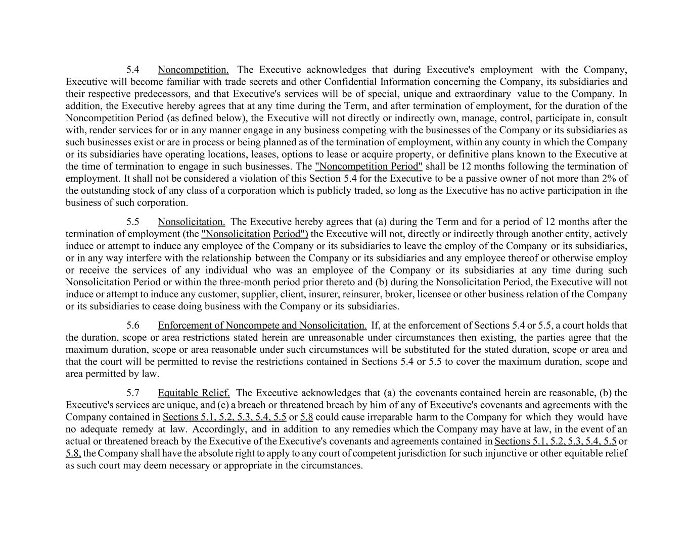 5.4 Noncompetition. The Executive acknowledges that during Executive's employment with the Company, Executive will become familiar with trade secrets and other Confidential Information concerning the Company, its subsidiaries and their respective predecessors, and that Executive's services will be of special, unique and extraordinary value to the Company. In addition, the Executive hereby agrees that at any time during the Term, and after termination of employment, for the duration of the Noncompetition Period (as defined below), the Executive will not directly or indirectly own, manage, control, participate in, consult with, render services for or in any manner engage in any business competing with the businesses of the Company or its subsidiaries as such businesses exist or are in process or being planned as of the termination of employment, within any county in which the Company or its subsidiaries have operating locations, leases, options to lease or acquire property, or definitive plans known to the Executive at the time of termination to engage in such businesses. The "Noncompetition Period" shall be 12 months following the termination of employment. It shall not be considered a violation of this Section 5.4 for the Executive to be a passive owner of not more than 2% of the outstanding stock of any class of a corporation which is publicly traded, so long as the Executive has no active participation in the business of such corporation. 5.5 Nonsolicitation. The Executive hereby agrees that (a) during the Term and for a period of 12 months after the termination of employment (the "Nonsolicitation Period") the Executive will not, directly or indirectly through another entity, actively induce or attempt to induce any employee of the Company or its subsidiaries to leave the employ of the Company or its subsidiaries, or in any way interfere with the relationship between the Company or its subsidiaries and any employee thereof or otherwise employ or receive the services of any individual who was an employee of the Company or its subsidiaries at any time during such Nonsolicitation Period or within the three-month period prior thereto and (b) during the Nonsolicitation Period, the Executive will not induce or attempt to induce any customer, supplier, client, insurer, reinsurer, broker, licensee or other business relation of the Company or its subsidiaries to cease doing business with the Company or its subsidiaries. 5.6 Enforcement of Noncompete and Nonsolicitation. If, at the enforcement of Sections 5.4 or 5.5, a court holds that the duration, scope or area restrictions stated herein are unreasonable under circumstances then existing, the parties agree that the maximum duration, scope or area reasonable under such circumstances will be substituted for the stated duration, scope or area and that the court will be permitted to revise the restrictions contained in Sections 5.4 or 5.5 to cover the maximum duration, scope and area permitted by law. 5.7 Equitable Relief. The Executive acknowledges that (a) the covenants contained herein are reasonable, (b) the Executive's services are unique, and (c) a breach or threatened breach by him of any of Executive's covenants and agreements with the Company contained in Sections 5.1, 5.2, 5.3, 5.4, 5.5 or 5.8 could cause irreparable harm to the Company for which they would have no adequate remedy at law. Accordingly, and in addition to any remedies which the Company may have at law, in the event of an actual or threatened breach by the Executive of the Executive's covenants and agreements contained in Sections 5.1, 5.2, 5.3, 5.4, 5.5 or 5.8, the Company shall have the absolute right to apply to any court of competent jurisdiction for such injunctive or other equitable relief as such court may deem necessary or appropriate in the circumstances.