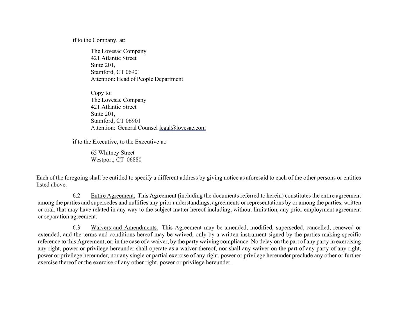 if to the Company, at: The Lovesac Company 421 Atlantic Street Suite 201, Stamford, CT 06901 Attention: Head of People Department Copy to: The Lovesac Company 421 Atlantic Street Suite 201, Stamford, CT 06901 Attention: General Counsel legal@lovesac.com if to the Executive, to the Executive at: 65 Whitney Street Westport, CT 06880 Each of the foregoing shall be entitled to specify a different address by giving notice as aforesaid to each of the other persons or entities listed above. 6.2 Entire Agreement. This Agreement (including the documents referred to herein) constitutes the entire agreement among the parties and supersedes and nullifies any prior understandings, agreements or representations by or among the parties, written or oral, that may have related in any way to the subject matter hereof including, without limitation, any prior employment agreement or separation agreement. 6.3 Waivers and Amendments. This Agreement may be amended, modified, superseded, cancelled, renewed or extended, and the terms and conditions hereof may be waived, only by a written instrument signed by the parties making specific reference to this Agreement, or, in the case of a waiver, by the party waiving compliance. No delay on the part of any party in exercising any right, power or privilege hereunder shall operate as a waiver thereof, nor shall any waiver on the part of any party of any right, power or privilege hereunder, nor any single or partial exercise of any right, power or privilege hereunder preclude any other or further exercise thereof or the exercise of any other right, power or privilege hereunder.