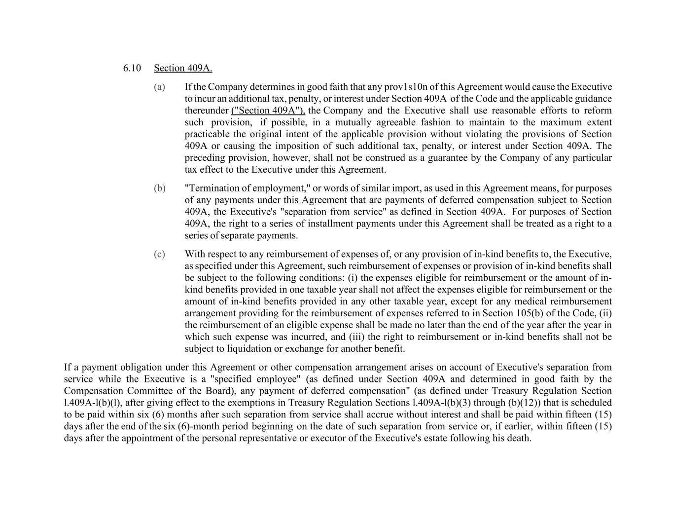 6.10 Section 409A. (a) If the Company determines in good faith that any prov1s10n of this Agreement would cause the Executive to incur an additional tax, penalty, or interest under Section 409A of the Code and the applicable guidance thereunder ("Section 409A"), the Company and the Executive shall use reasonable efforts to reform such provision, if possible, in a mutually agreeable fashion to maintain to the maximum extent practicable the original intent of the applicable provision without violating the provisions of Section 409A or causing the imposition of such additional tax, penalty, or interest under Section 409A. The preceding provision, however, shall not be construed as a guarantee by the Company of any particular tax effect to the Executive under this Agreement. (b) "Termination of employment," or words of similar import, as used in this Agreement means, for purposes of any payments under this Agreement that are payments of deferred compensation subject to Section 409A, the Executive's "separation from service" as defined in Section 409A. For purposes of Section 409A, the right to a series of installment payments under this Agreement shall be treated as a right to a series of separate payments. (c) With respect to any reimbursement of expenses of, or any provision of in-kind benefits to, the Executive, as specified under this Agreement, such reimbursement of expenses or provision of in-kind benefits shall be subject to the following conditions: (i) the expenses eligible for reimbursement or the amount of in- kind benefits provided in one taxable year shall not affect the expenses eligible for reimbursement or the amount of in-kind benefits provided in any other taxable year, except for any medical reimbursement arrangement providing for the reimbursement of expenses referred to in Section 105(b) of the Code, (ii) the reimbursement of an eligible expense shall be made no later than the end of the year after the year in which such expense was incurred, and (iii) the right to reimbursement or in-kind benefits shall not be subject to liquidation or exchange for another benefit. If a payment obligation under this Agreement or other compensation arrangement arises on account of Executive's separation from service while the Executive is a "specified employee" (as defined under Section 409A and determined in good faith by the Compensation Committee of the Board), any payment of deferred compensation" (as defined under Treasury Regulation Section l.409A-l(b)(l), after giving effect to the exemptions in Treasury Regulation Sections l.409A-l(b)(3) through (b)(12)) that is scheduled to be paid within six (6) months after such separation from service shall accrue without interest and shall be paid within fifteen (15) days after the end of the six (6)-month period beginning on the date of such separation from service or, if earlier, within fifteen (15) days after the appointment of the personal representative or executor of the Executive's estate following his death.