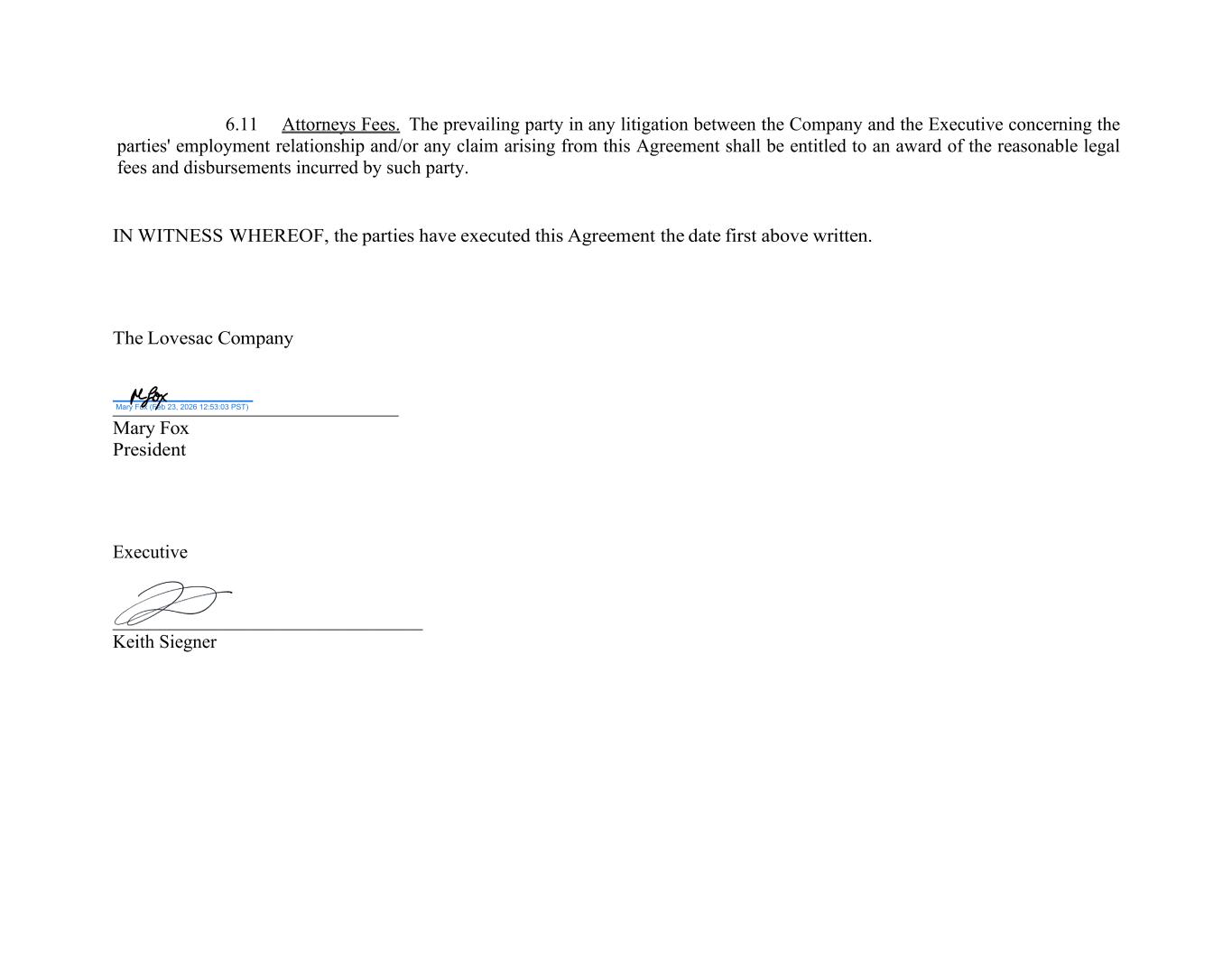 6.11 Attorneys Fees. The prevailing party in any litigation between the Company and the Executive concerning the parties' employment relationship and/or any claim arising from this Agreement shall be entitled to an award of the reasonable legal fees and disbursements incurred by such party. IN WITNESS WHEREOF, the parties have executed this Agreement the date first above written. The Lovesac Company _____________________________ Mary Fox President Executive _________________________________ Keith Siegner Mary Fox (Feb 23, 2026 12:53:03 PST)