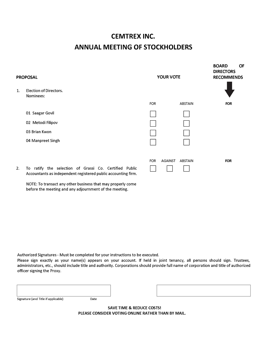 “FOR” the election of each of the four nominees, Saagar Govil, Metodi Filipov, Brian Kwon, and Manpreet Singh proposed by the Board of Directors to serve as directors, each for a term of one year or until Cemtrex’s 2025 Annual Meeting of Stockholders (Proposal 1);