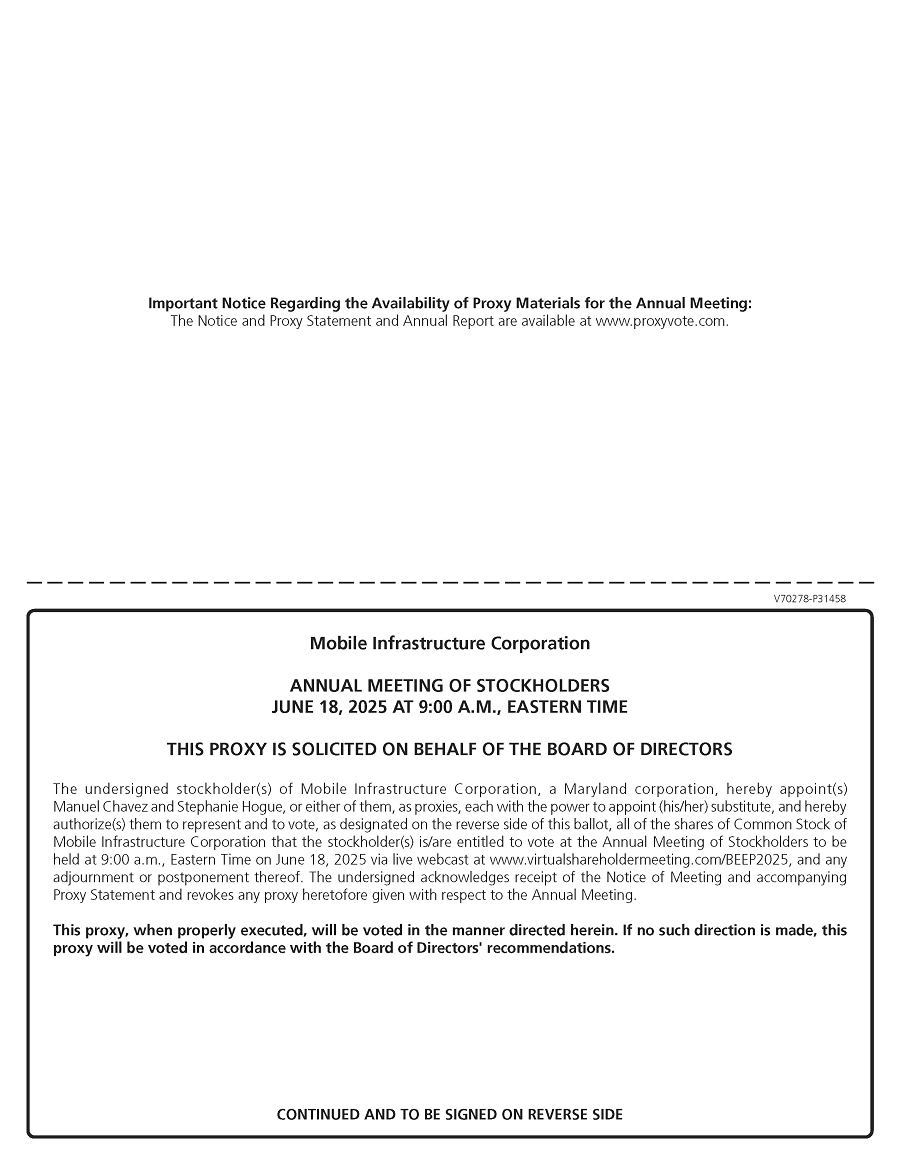 You are cordially invited to the 2025 Annual Meeting of Stockholders (the “Annual Meeting”) of Mobile Infrastructure Corporation (“we,” “us,” “our,” or the “Company”) to be held on Wednesday, June 18, 2025, at 9:00 a.m., Eastern Time.