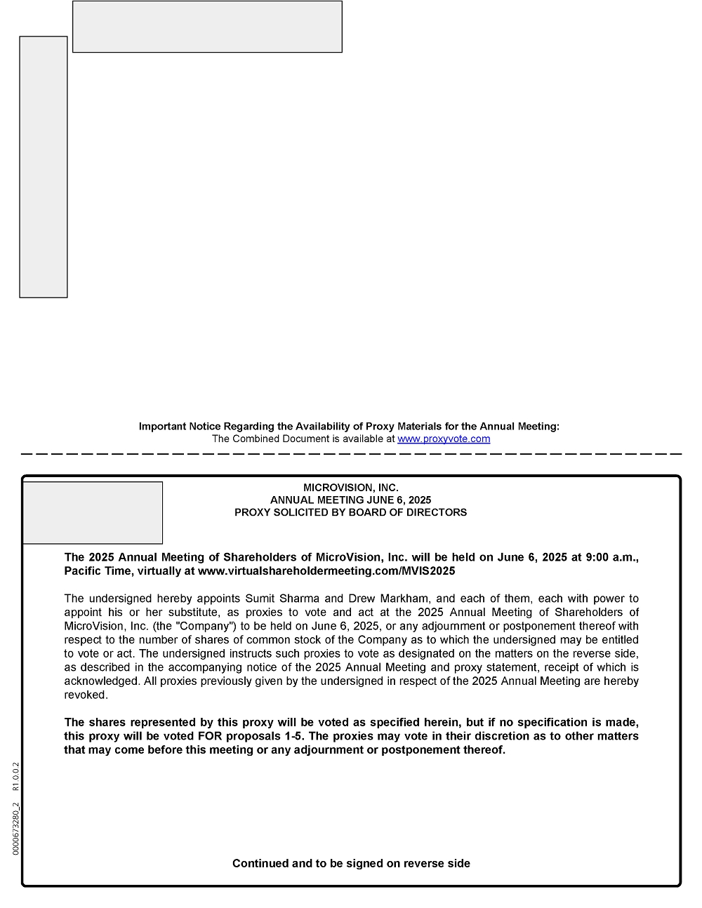 The 2025 Annual Meeting of Shareholders of MicroVision, Inc., a Delaware corporation, will be held on Friday, June 6, 2025 at 9:00 a.m., Pacific Time. The Annual Meeting will be a virtual meeting held online at www.virtualshareholdermeeting.com/MVIS2025 via a live webcast. Shareholders of record at the close of business on April 7, 2025 and holders of proxies for those shareholders may attend and vote at the Annual Meeting. You will be able to vote and submit questions online through the virtual meeting platform during the Annual Meeting. You will not be able to attend the Annual Meeting in person.