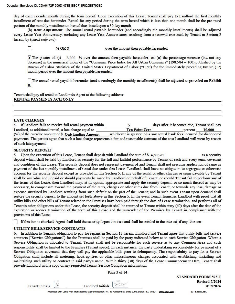 Annual Escalations:  Commencing on the 1st anniversary of the Lease Commencement Base rental shall increase by (3.0%) based on CPI Index on an annual basis throughout term.