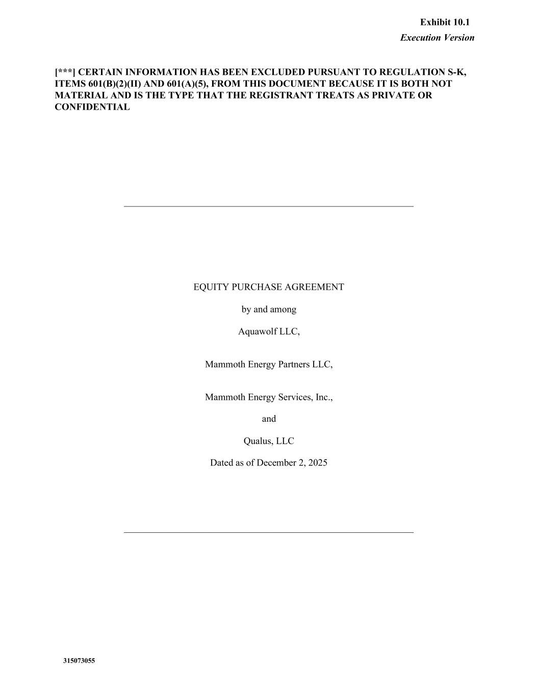 Execution Version 315073055 ____________________________________________________________ EQUITY PURCHASE AGREEMENT by and among Aquawolf LLC, Mammoth Energy Partners LLC, Mammoth Energy Services, Inc., and Qualus, LLC Dated as of December 2, 2025 ____________________________________________________________ [***] CERTAIN INFORMATION HAS BEEN EXCLUDED PURSUANT TO REGULATION S-K, ITEMS 601(B)(2)(II) AND 601(A)(5), FROM THIS DOCUMENT BECAUSE IT IS BOTH NOT MATERIAL AND IS THE TYPE THAT THE REGISTRANT TREATS AS PRIVATE OR CONFIDENTIAL Exhibit 10.1